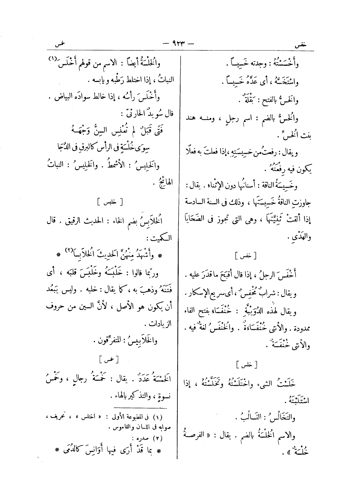وأَخْسَسْتُهُ: وجدته خَسيساً. واسْتَخَسَّهُ، أي عَدَّهُ خَسيساً. والخَسُّ بالفتح: بَقْلَةٌ. والخس بالضم: اسم رجل، ومنه هند بنت الخس. ويقال: رفعت من خسيسَتِهِ، إذا فعلتَ به فعلاً يكون فيه رِفْعَتُهُ. وخَسيسَةُ الناقة: أسنانُها دون الإثْناءِ. يقال: جاوزتِ الناقةُ خَسيسَتَها، وذلك في السنة السادسة إذا ألقتْ ثَنِيَّتَها، وهي التي تجوز في الضحايا والهدى.