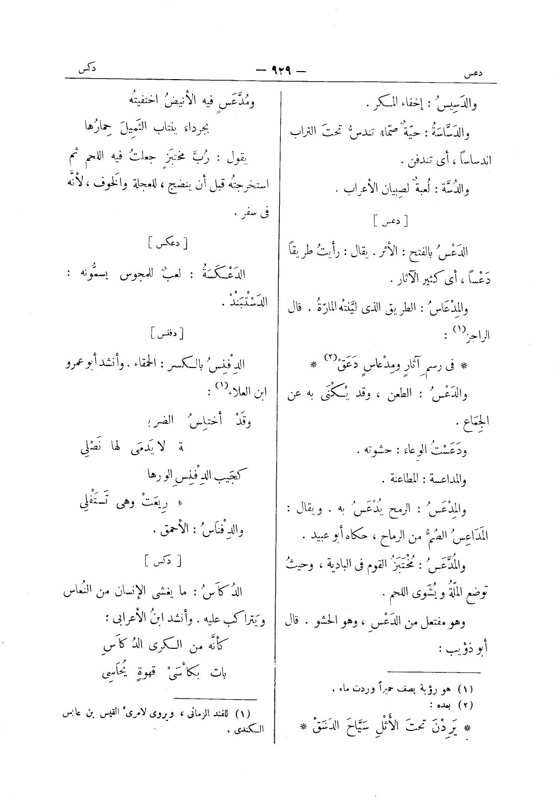 في رسم آثار ومدعاس دعق (¬2) * والدعس: الطعن، وقد يكنى به عن الجِماع. ودَعَسْتُ الوعاءَ: حشوته. والمداعسة: المطاعنه. والمِدْعَسُ: الرمح يُدْعِسُ به. ويقال: المداعِسُ الصُمُّ من الرماح، حكاه أبو عبيد. والمدعس: مختبز القوم في البادية، وحيثُ توضع الملّةُ ويشوى اللحم. وهو مفتعل من الدعس، وهو الحشو. قال أبو ذؤيب