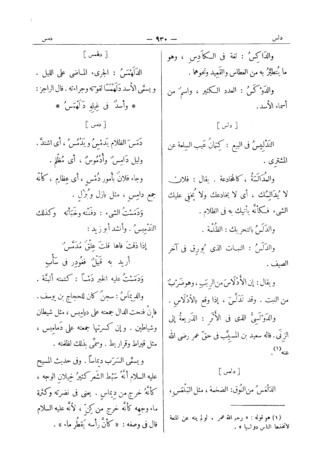 [دلس] التَدْليسُ في البيع: كِتمانُ عَيب السِلعة عن المشتري. والمُدالَسَةُ، كالمخادعة. يقال: فلان لا يُدالِسكَ، أي لا يخادعك ولا يُخفي عليك الشئ فكأنه يأتيك به في الظلام. والدَلَسُ بالتحريك: الظُلْمة. والدَلَسُ: النبات الذي يورِق في آخر الصيف. ويقال: إن الأَدْلاسَ من الرِبَبِ، وهو ضَرْبٌ من النبت. وقد تَدَلَّسَ، إذا وقع بالأدْلاسِ. والدَوْلَسيُّ الذي في الأثَرِ: الذريعة إلى الزنى (الزبى) . قاله سعيد بن المسيب في حق عمر رضى الله عنه (¬1) .