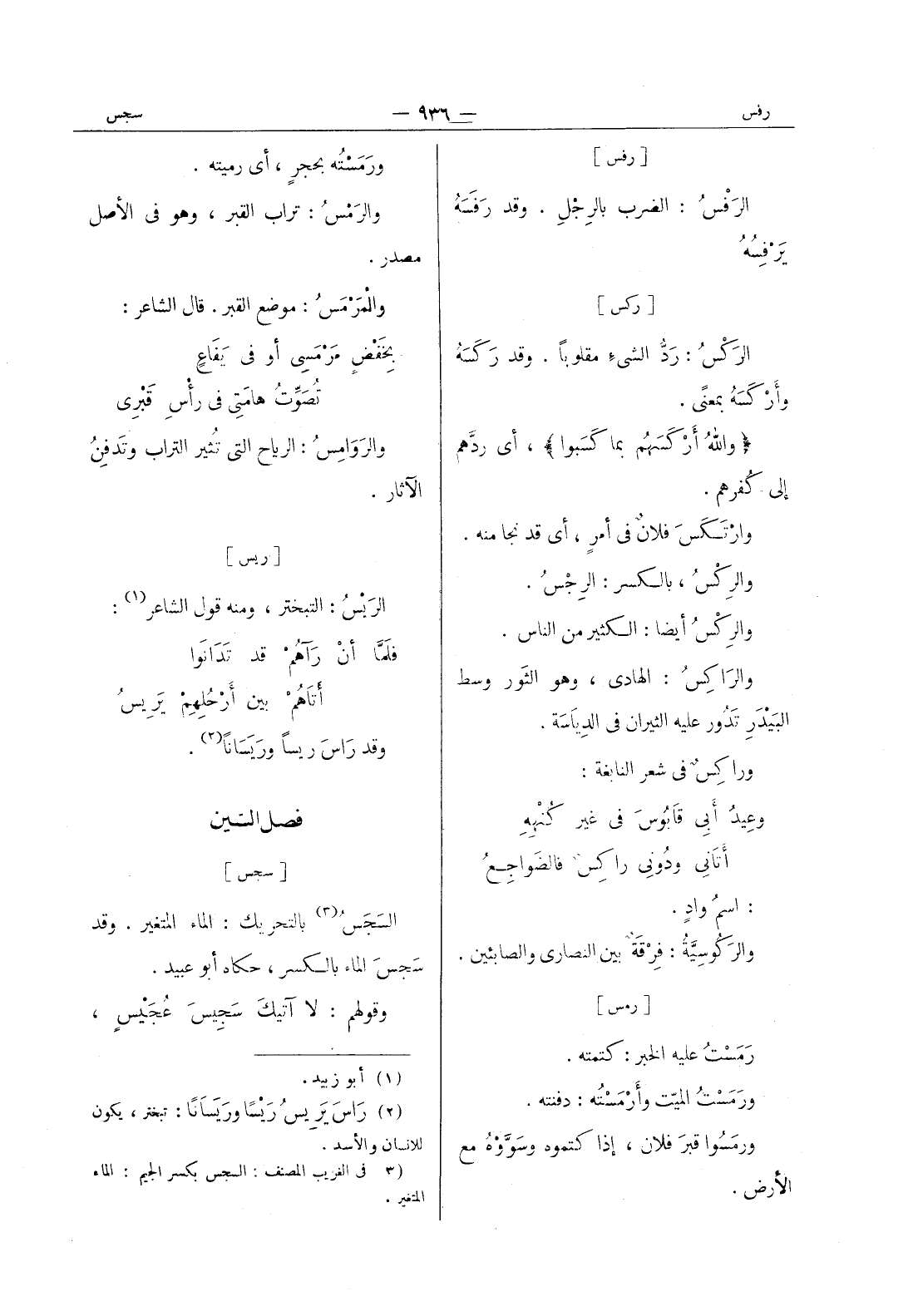 [ركس] الركس: رد الشئ مقلوبا. وقد رَكَسَهُ وأَرْكَسَهُ بمعنىً. {واللهُ أَرْكَسَهُمْ بما كَسَبوا} ، أي ردَّهم إلى كُفرهم. وارْتَكَسَ فلانٌ في أمرٍ، أي قد نجا منه. والرِكْسُ، بالكسر: الرِجْسُ. والرِكْسُ أيضاً: الكثير من الناس. والراكِسُ: الهادي، وهو الثَور وسط البَيْدَرِ تَدور عليه الثيران في الدياسة. وراكس في شعر النابغة: وعيد أبى قابوس في غير كنهه * أتانى ودوني راكس فالضواجع *: اسم واد. والركوسية: فرقة بين النصارى والصابئين.