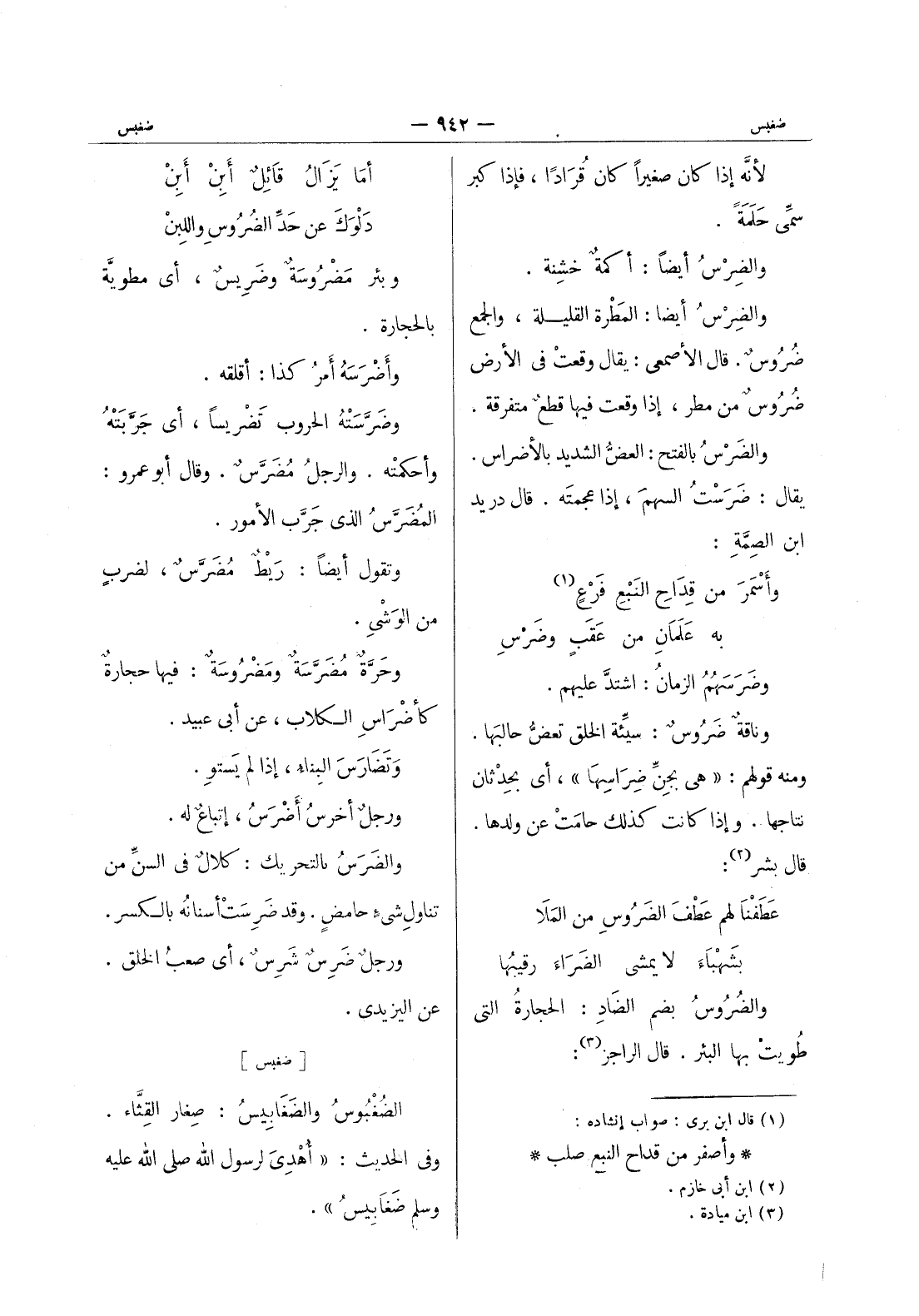 لانه إذا كان صغيرا كان قرادا، فإذا كبر سمى حلمة. والضرس أيضا: أكمة خشنة. والضِرْسُ أيضاً: المَطْرة القليلة، والجمع ضروس. قال الاصمعي: يقال وقعت في الارض ضروس من مطر، إذا وقعت فيها قطع متفرقة. والضرس بالفتح: العض الشديد بالأضراس. يقال: ضَرَسْتُ السهمَ، إذا عجمته. قال دريد ابن الصمة: وأسمر من قداح النَبْع فَرعٍ (¬1) * به عَلمانِ من عقب وضرس * وضَرَسَهُمُ الزمان: اشتدَّ عليهم. وناقةٌ ضَروسٌ: سيِّئة الخلق تعضُّ حالبها. ومنه قولهم: " هي بجن ضراسها "، أي بحدثان نتاجها. وإذا كانت كذلك حامت عن ولدها. قال بشر (¬2) : عَطفْنا لهم عَطْفَ الضروسِ من المَلا * بشهْباَء لا يمشي الضراء رقيبها * والضروس بضم الضاد: الحجارة التى طويت بها البئر. قال الراجز (¬3)