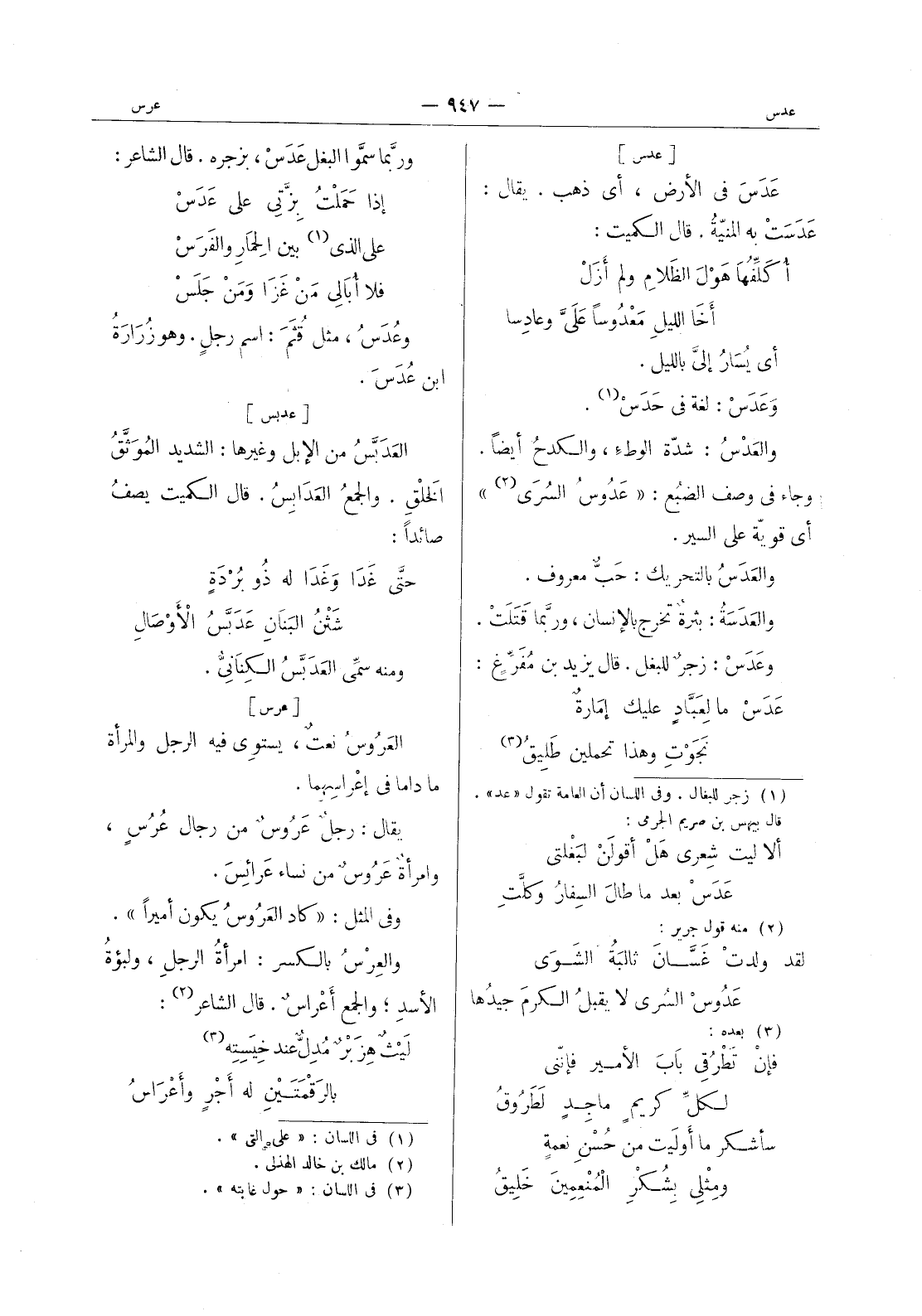 [عدس] عَدَسَ في الأرض، أي ذهب. يقال: عَدَسَتْ به المنيّةُ. قال الكميت: أُكَلِّفُها هَوْلَ الظَلامِ ولم أزَلْ * أخا الليلِ مَعْدوساً عَلَيَّ وعادِسا * أي يُسارُ إليّ بالليل. وعَدَسْ: لغة في حَدَسْ (¬1) . والعدس: شدة الوطئ، والكدح أيضا. وجاء في وصف الضبُع: " عَدوسُ السُرى (¬2) " أي قويّة على السير. والعدس بالتحريك: حب معروف. والعَدَسَةُ: بثرةٌ تخرج بالإنسان، وربَّما قَتَلَتْ. وعَدَسْ: زجرٌ للبغل. قال يزيد بن مُفَرِّغٍ: عَدَسْ ما لِعَبَّادٍ عليك إمارَةٌ * نجوْتِ وهذا تحملين طليق (¬3) *