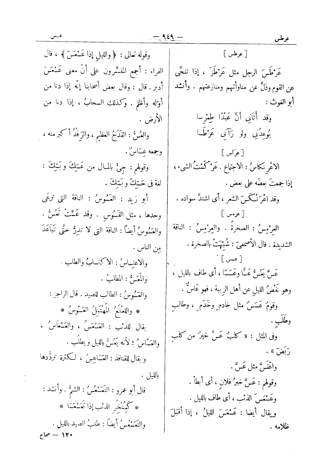 وقوله تعالى: {والليلِ إذا عَسْعَسَ} ، قال الفراء: أجمع المفسرون على أن معنى عسعس أدبر. قال: وقال بعض أصحابنا أنّه إذا دنا من أوَّله وأظلم. وكذلك السحابُ، إذا دنا من الارض. والعُسُّ: القَدَحُ العظيم، والرَفْدُ أكبر منه، وجمعه عِساسٌ. وقولهم: جِئْ بالمال من عَسِّكَ وبَسِّكَ: لغة في حَسِّكَ وبَسِّكَ. أبو زيد: العَسوسُ: الناقة التي ترعى وحدها، مثل القَسوسِ. وقد عَسَّتْ تَعُسُّ. والعَسوسُ أيضاً: الناقة التي لا تدِرُّ حتَّى تَباعَدَ مِن الناس. والاعتِساسُ: الاكتسابُ والطلب. والمَعَسُّ: المطلبُ. والعسوس: الطالب للصيد. قال الراجز:
