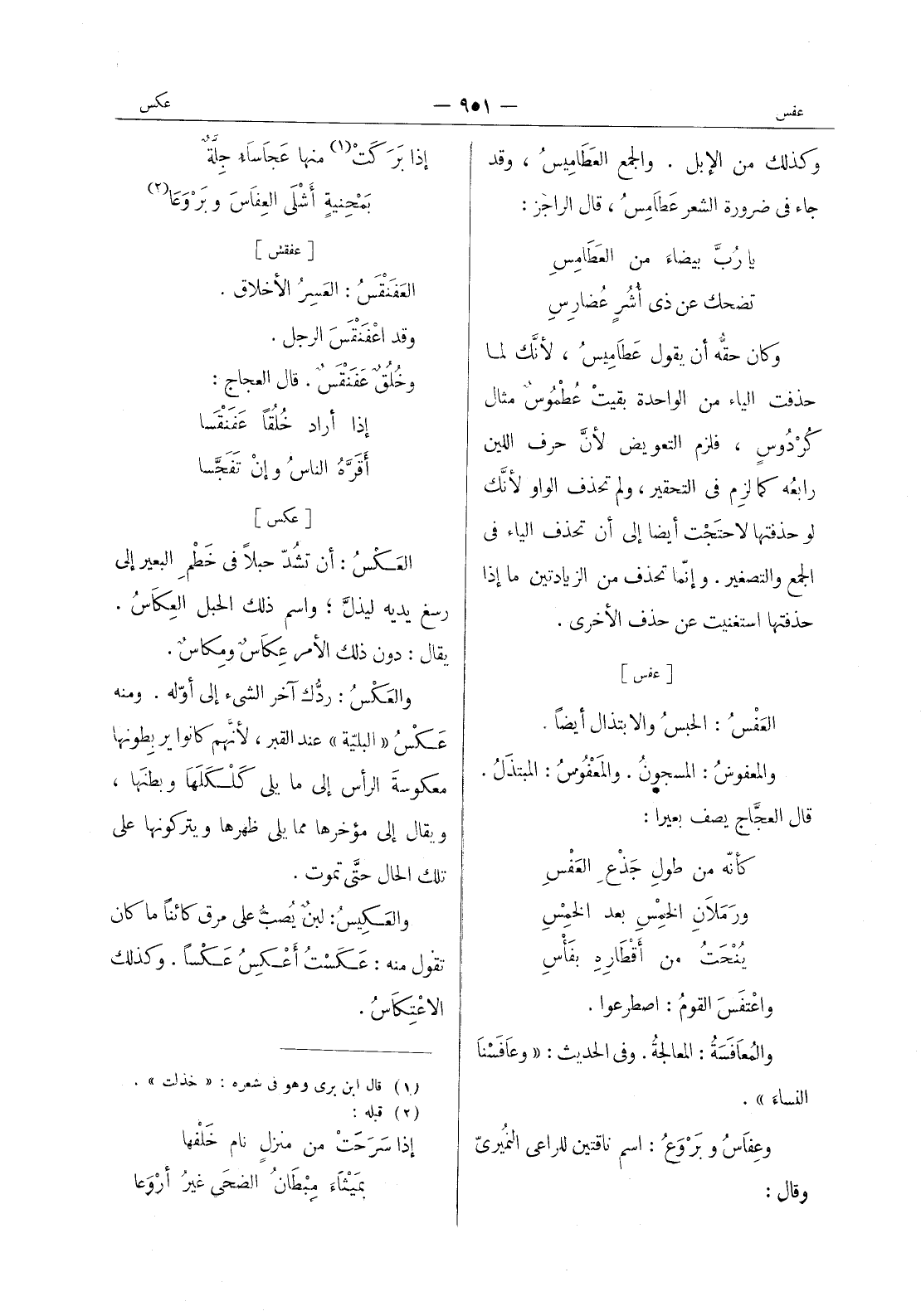 [عفس] العَفْسُ: الحبسُ والابتذال أيضاً. والمعفوس: المسجون. والمعفوس: المبتذل. قال العجاج يصف بعيرا: كأنه من طول جذع العفس * ورملان الخمس بعد الخمس * ينحت من أقطاره بفأس * واعتفس القومُ: اصطرعوا. والمُعافسةُ: المعالجة. وفي الحديث: " وعافسنا النساء ". وعفاس وبروع: اسم ناقتين للراعي النميري وقال: