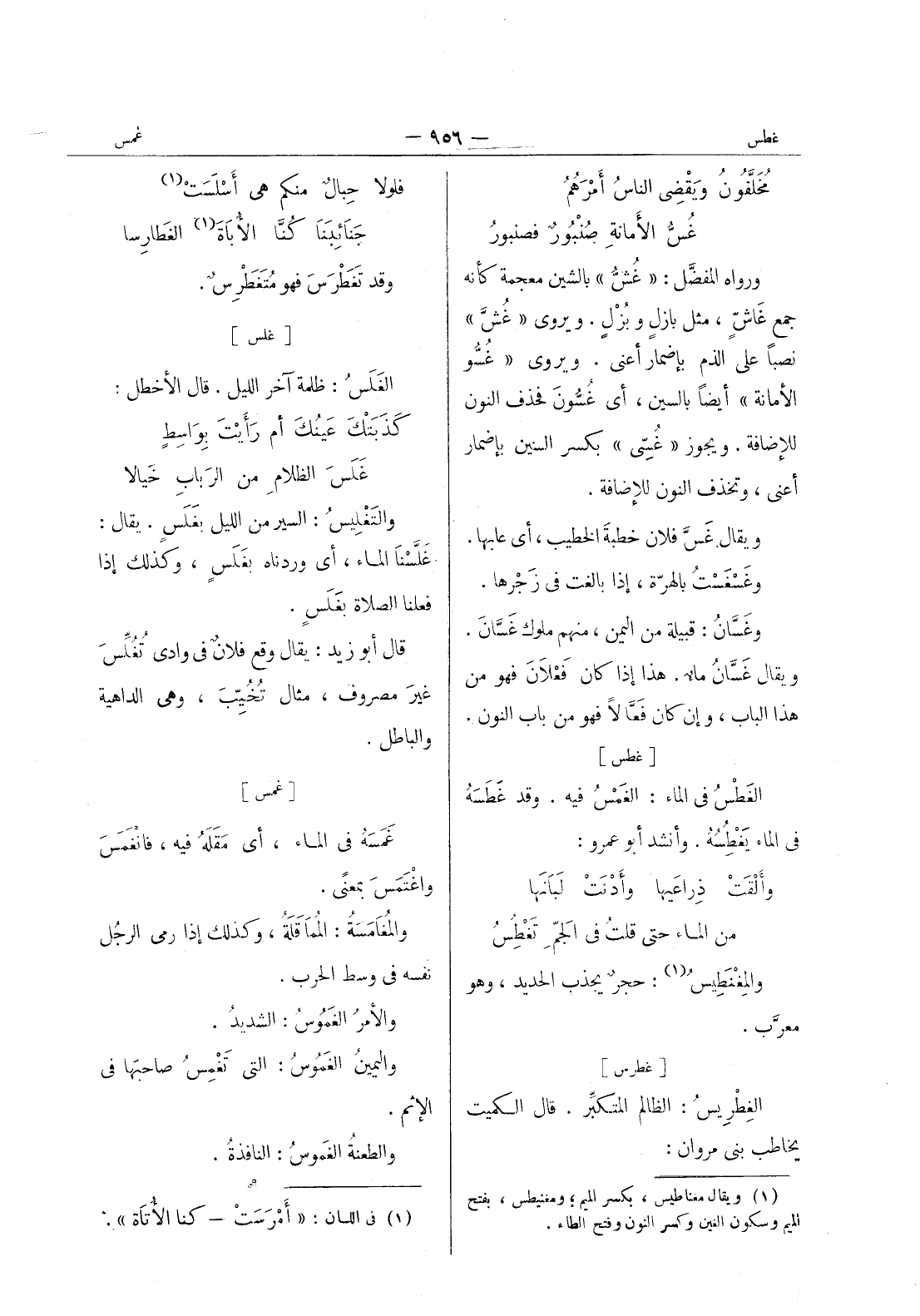 [غطس] الغطس في الماء: الغمس فيه. وقد غَطَسَهُ في الماء يَغْطِسُهُ. وأنشد أبو عمرو: وألقتْ ذراعيها وأدنتْ لَبانَها * من الماء حتَّى قلتُ في الجَمِّ تَغْطِسُ * والمغنطيس (¬1) : حجر يجذب الحديد، وهو معرب.