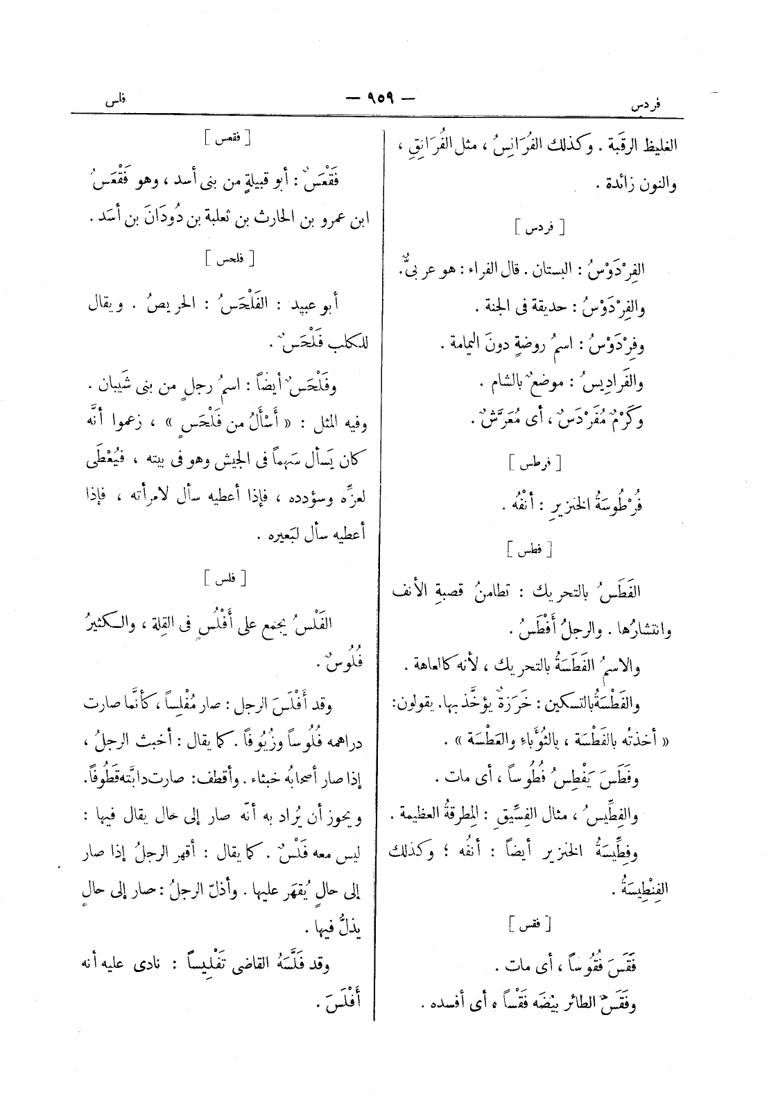 [فلس] الفَلْسُ يجمع على أفْلُسٍ في القِلة، والكثيرُ فُلوسٌ. وقد أفْلَسَ الرجل: صار مُفْلِساً، كأنَّما صارت دراهمه فلوسا وزيوفا. كما يقال: أخبث الرجل، إذا صار أصحابه خبثاء. وأقطف: صارت دابته قطوفا. ويحوز أن يراد به أنه صار إلى حال يقال فيها: ليس معه فلس. كما يقال: أقهر الرجل إذا صار إلى حال يقهر عليها. وأذل الرجل: صار إلى حال يذل فيها. وقد فَلَّسَهُ القاضي تَفْليساً: نادى عليه أنه أفلس.
