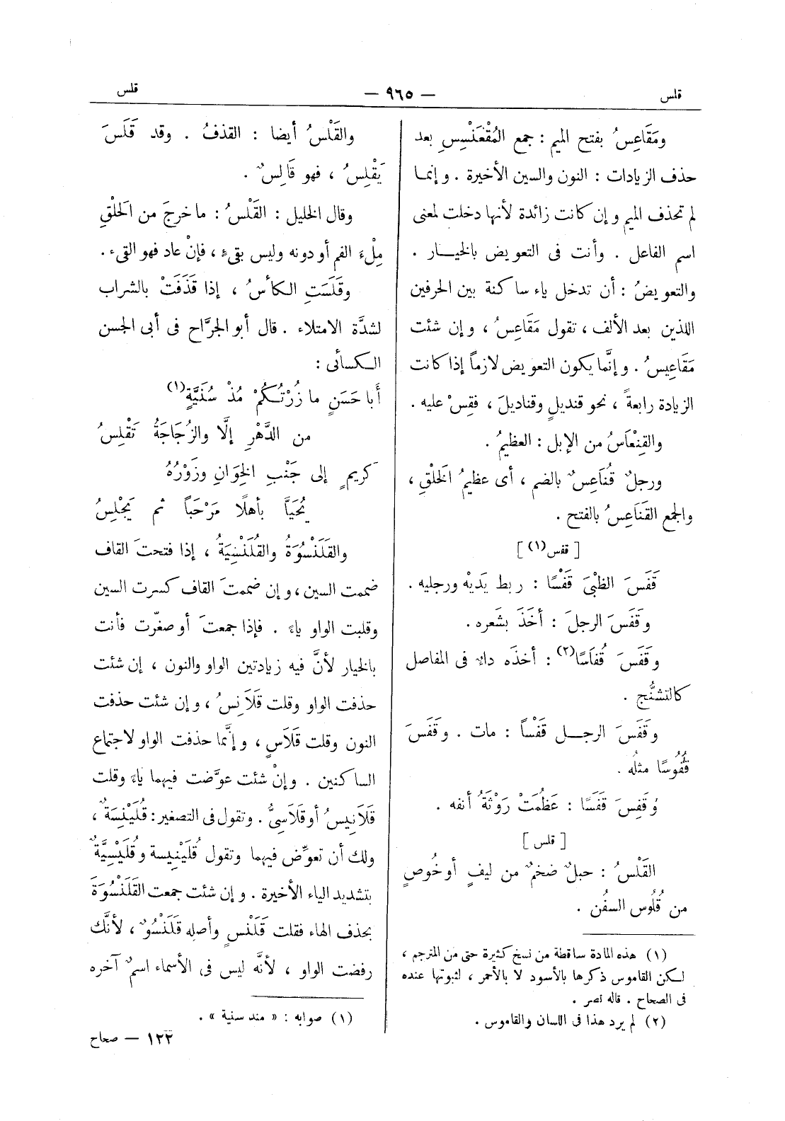 والقلس أيضا: القذف. وقد قَلَسَ يَقْلِسُ، فهو قالِسٌ. وقال الخليل: القَلْسُ: ما خرج من الحلقِ مِلء الفم أو دونه وليس بقئ، فإن عاد فهو القئ. وقلست الكأس، إذا قذفت بالشراب لشدَّة الامتلاء. قال أبو الجراح في أبى الجسن الكسائي: أبا حَسَنٍ ما زُرْتُكُمْ مُذْ سُنَيَّةٍ (¬1) * من الدَّهرِ إلاَّ والزُجاجَةُ تَقْلِسُ * كريمٍ إلى جَنْبِ الخِوانِ وزَوْرُهُ * يُحَيَّا بأهلاً مَرْحَباً ثمَّ يجلس * والقلنسوة والقلنسية، إذا فتحت القاف ضممت السين، وإن ضمت القاف كسرت السين وقلبت الواو ياء. فإذا جمعت أو صغرت فأنت بالخيار لان فيه زيادتين الواو والنون، إن شئت حذفت الواو وقلت قلانس، وإن شئت حذفت النون وقلت قلاس، وإنما حذفت الواو لاجتماع الساكنين. وإن شئت عوضت فيهما ياء وقلت قلانيس أو قلاسى. وتقول في التصغير: قلينسة، ولك أن تعوض فيهما وتقول قلينيسة وقليسية بتشديد الياء الاخيرة، وإن شئت جمعت القلنسوة بحذف الهاء فقلت قلنس وأصله قلنسو، لانك رفضت الواو، لانه ليس في الاسماء اسم آخره