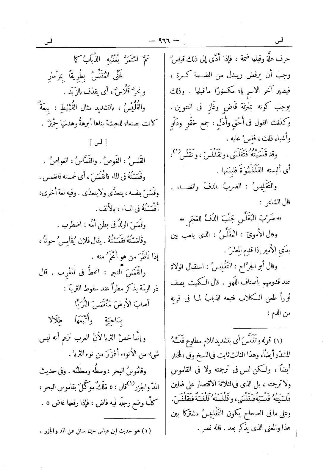 [قمس] القَمْسُ: الغَوصُ. والقَمَّاسُ: الغواصُ. وقَمَسْتُهُ في الماء فانْقَمَسَ، أي غمسته فانغمس. وقَمَسَ بنفسه، يتعدَّى ولا يتعدى. وفيه لغة أخرى: أقْمَسْتُهُ في الماء، بالألف. وقَمَسَ الولدُ في بطن أمِّه: اضطرب. وقامَسْتُهُ فقَمَسْتُهُ. يقال فلان يُقامِسُ حوتاً، إذا ناظَرَ من هو أعْلَمُ منه. وانْقَمَسَ النجم: انحطَّ في المغرب. قال ذو الرمة يذكر مطرا عند سقوط الثريا: أصاب الارض منقمس الثريا * بساحية وأتبعها طلالا * وإنما خص الثريا لان العرب تزعم أنه ليس شئ من الانواء أغزر من نوء الثريا. وقاموس البحر: وسطه ومعظمه. وفى حديث المد والجزر (¬1) قال: " ملك موكل بقاموس البحر، كلما وضع رجله فيه فاض، فإذا رفعها غاض ".