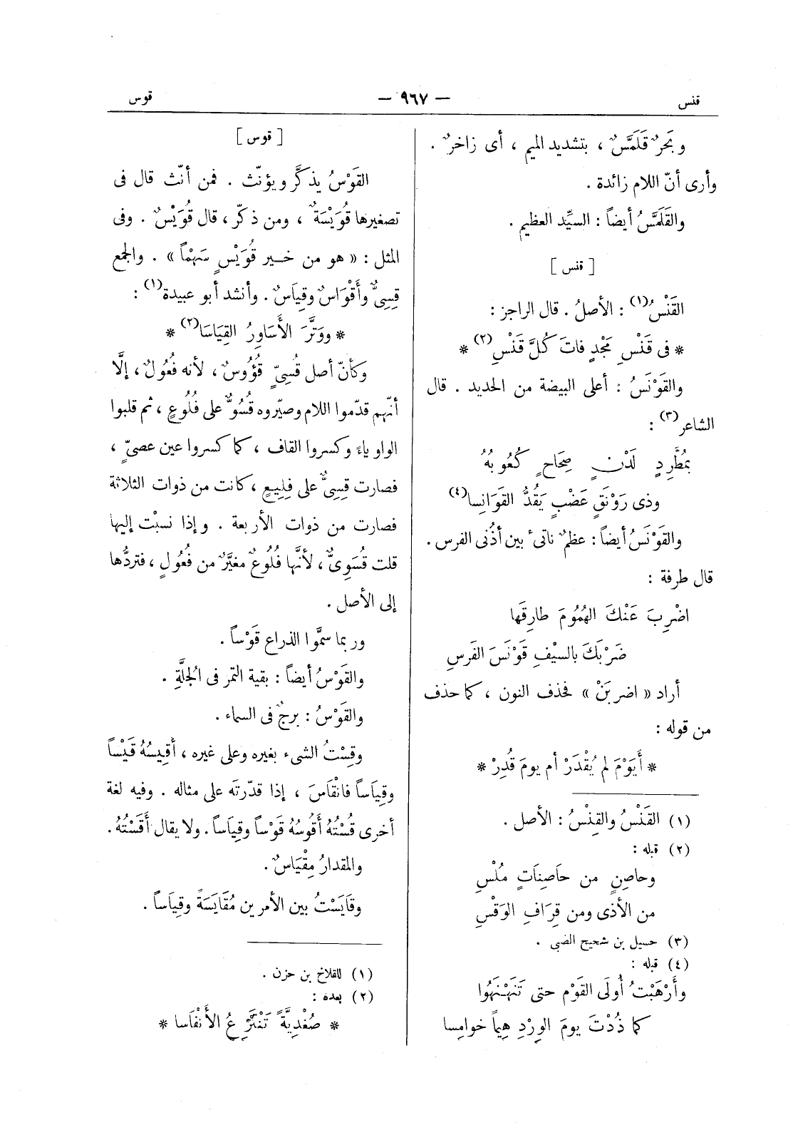في قَنْسِ مجدٍ فاتَ كلَّ قَنْسِ (¬2) * والقَوْنَسُ: أعلى البيضة من الحديد. قال الشاعر (¬3) : بمطَّردٍ لَدْنٍ صِحاحٍ كُعوبهُ * وذي رونَقٍ عَضْبٍ يقُدُّ القَوانِسا (¬4) * والقَوْنَسُ أيضاً: عظمٌ ناتئ بين أذنى الفرس. قال طرفة: اضرب عنك الهموم طارقها * ضربك بالسيف قونس الفرس * أراد " اضربن " فحذف النون، كما حذف من قوله: