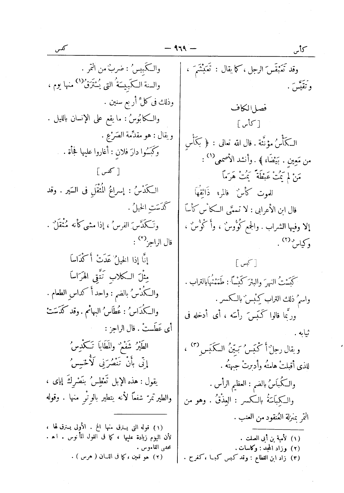 [كدس] الكَدْسُ: إسراعُ المُثْقَلِ في السَير. وقد كَدَسَت الخيل. وتَكَدَّسَ الفرس، إذا مشى كأنه مًثْقَلٌ. قال الراجز (¬2) : إنا إذا الخيل عدت أكداسا * مثل الكلاب تتقى الهراسا * والكُدْسُ بالضم: واحد أكداسِ الطعام. والكُداسُ: عُطاسُ البهائم. وقد كَدَسَتْ أي عطست. قال الراجز: الطير شفع والمطايا تكدس * إنى بأن تنصرنى لاحسس * يقول: هذه الابل تعطس بنصرك إياى، والطير تمر شفعا لانه يتطير بالوتر منها. وقوله