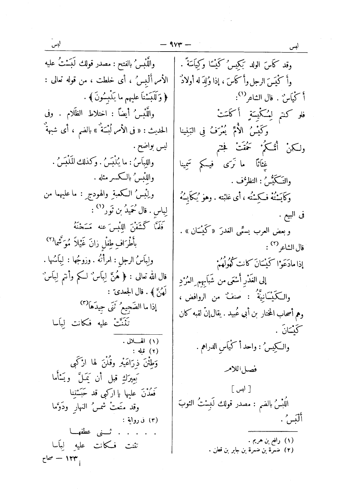 واللبس بالفتح: مصدر قولك لَبَسْتُ عليه الأمر ألْبِسُ، أي خلطت، من قوله تعالى: {ولَلَبَسْنا عليهم ما يَلْبِسونَ} . واللَّبْسُ أيضاً: اختلاط الظلام. وفي الحديث: " في الأمر لُبْسَةٌ " بالضم، أي شبهةٌ ليس بواضح. واللِباسُ: ما يُلْبَسُ. وكذلك المَلْبَسُ. واللِبْسُ بالكسر مثله. ولِبْسُ الكعبةِ والهودجِ: ما عليهما من لِباسٍ. قال حميد بن ثور (¬1) : فلمَّا كَشَفْنَ اللِبْسَ عنه مَسَحْنَهُ * بأطرافِ طِفْلٍ زانَ غَيْلاً مُوَشَّما (¬2) * ولِباسُ الرجل: امرأته. وزوجُها: لِباسُها. قال الله تعالى: {هن لباس لكم وأنتم لباس لَهُنَّ} . قال الجعديّ: إذا ما الضَجيعُ ثَنى جيدَها (¬3) * تثَنَّتْ عليه فكانت لباسا *
