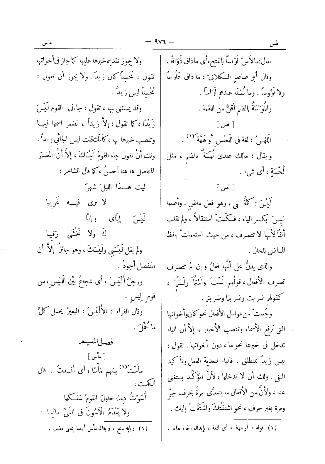[ليس] لَيْسَ: كلمةُ نفي، وهو فعل ماض. وأصلها ليس بكسر الياء، فسكنت استثقالا، ولم تقلب ألفا لانها لا تتصرف، من حيث استعملت بلفظ الماضي للحال. والذى يدل على أنها فعلٌ وإن لم تتصرف تصرف الأفعال، قولهم لَسْتَ ولَسْتُما ولَسْتُمْ، كقولهم ضربت وضربتما وضربتم. وجُعلت من عوامل الأفعال نحو كان وأخواتها التي ترفع الأسماء وتنصب الأخبار، إلا أن الباء تدخل في خبرها نحو ما، دون أخواتها. تقول: ليس زيدٌ بمنطلق. فالباء لتعدية الفعل وتأكيد النفي. ولك أن لا تدخلها، لأن المؤكَّد يستغنى عنه، ولأن من الأفعال ما يتعدَّى مرةً بحرف جرٍّ ومرة بغير حرف، نحو اشتقتك واشتقت إليك.