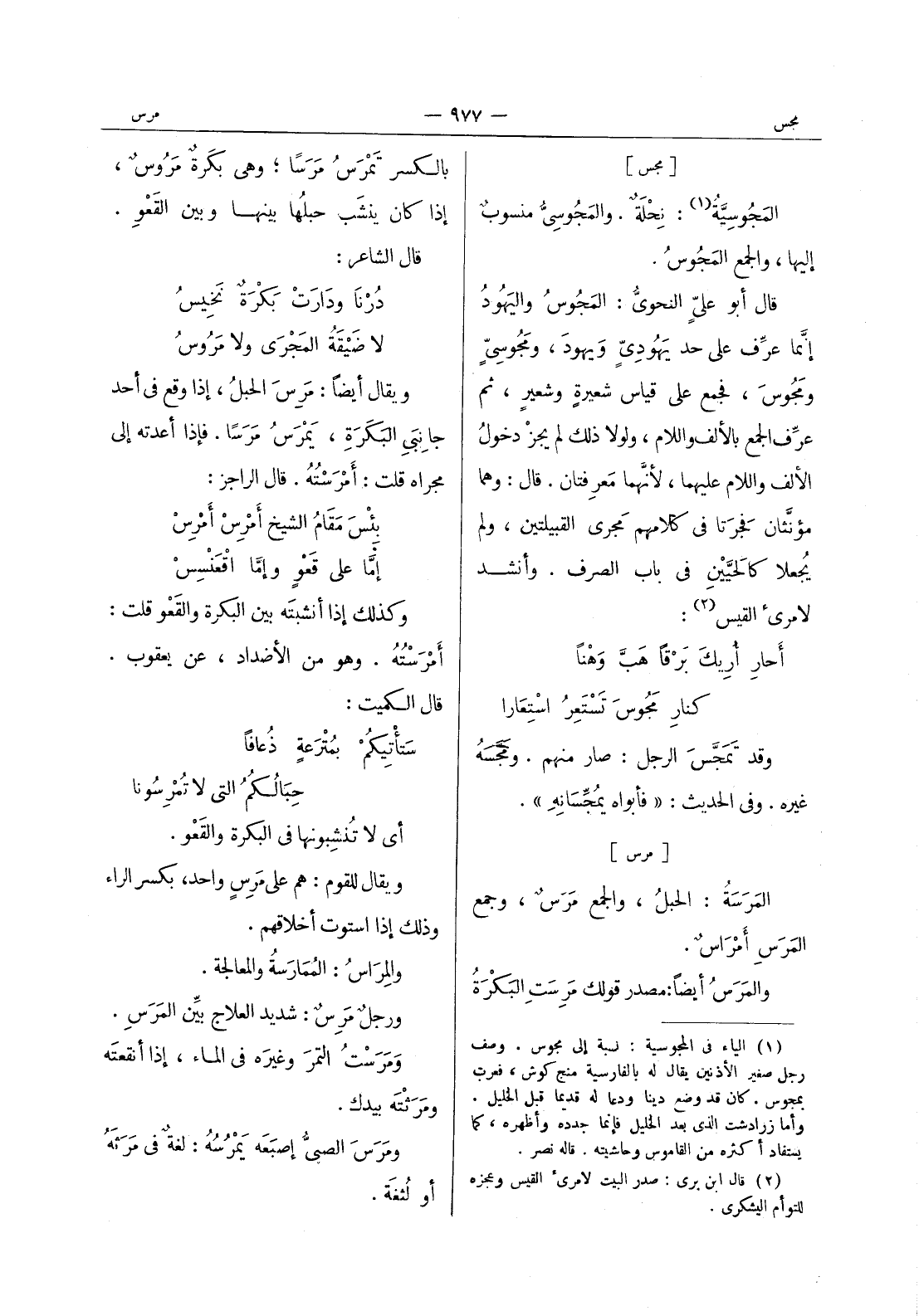 [مجس] المَجوسِيَّةُ (¬1) : نِحْلَةٌ. والمَجوسِيُّ منسوبٌ إليها، والجمع المجوس. قال أبو على النحوي: المجوس واليهود إنما عرف على حد يهودى ويهود، ومجوسى ومجوس، فجمع على قياس شعيرة وشعير، ثم عرف الجمع بالالف واللام، ولولا ذلك لم يجز دخول الالف واللام عليهما، لان معرفتان. قال: وهما مؤنثان فجرتا في كلامهم مجرى القبيلتين، ولم يجعلا كالحيين في باب الصرف. وأنشد لامرئ القيس (¬2) : أَحارِ أُريكَ بَرْقاً هَبَّ وَهْناً * كنارِ مَجوسَ تَسْتَعِرُ اسْتِعارا * وقد تَمَجَّسَ الرجل: صار منهم. ومَجَّسَهُ غيره. وفي الحديث: " فأبواه يمجسانه ".