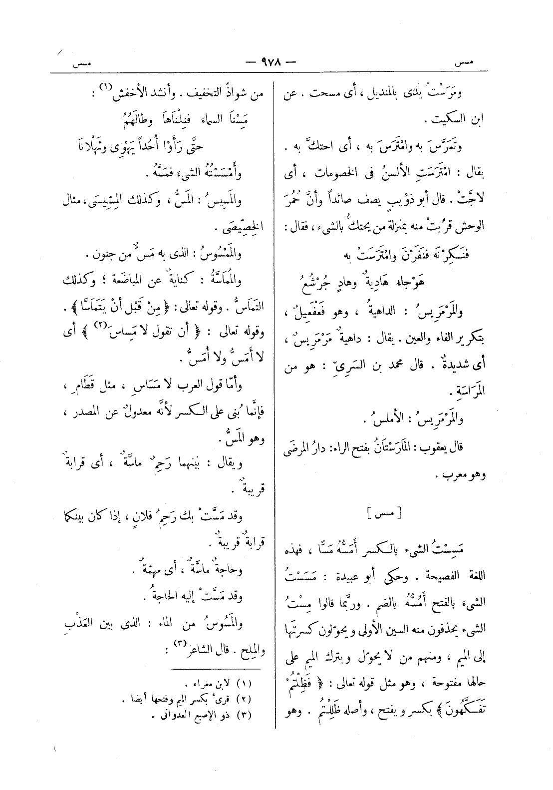 من شواذ التخفيف. وأنشد الاخفش (¬1) : مِسْنا السماَء فنِلْناها وطالَهُمُ * حتَّى رأوْا أحُداً يَهْوي وثَهْلانا * وأمْسَسْتُهُ الشئ فمسه. والمسيس: المس، وكذلك المسيسى، مثال الخصيصى. والممسوس: الذى به مس من جنون. والمُماسَّةُ: كنايةٌ عن المُباضَعة ; وكذلك التماسُّ. وقوله تعالى: {من قبل أن يتَماسَّا} . وقوله تعالى: {أن تقول لا مَساسَ (¬2) } أي لا أمسُّ ولا أُمَسُّ. وأمَّا قول العرب لا مَساسِ، مثل قطامِ، فإنَّما بُني على الكسر لأنَّه معدولٌ عن المصدر، وهو المَسُّ. ويقال: بينهما رَحِمٌ ماسَّةٌ، أي قرابةٌ قريبةٌ. وقد مَسَّتْ بك رَحِمُ فلانٍ، إذا كان بينكما قرابةٌ قريبةٌ. وحاجةٌ ماسَّةٌ، أي مهمَّةٌ. وقد مَسَّتْ إليه الحاجة. والمَسوسُ من الماء: الذي بين العذب والملح. قال الشاعر (¬3)