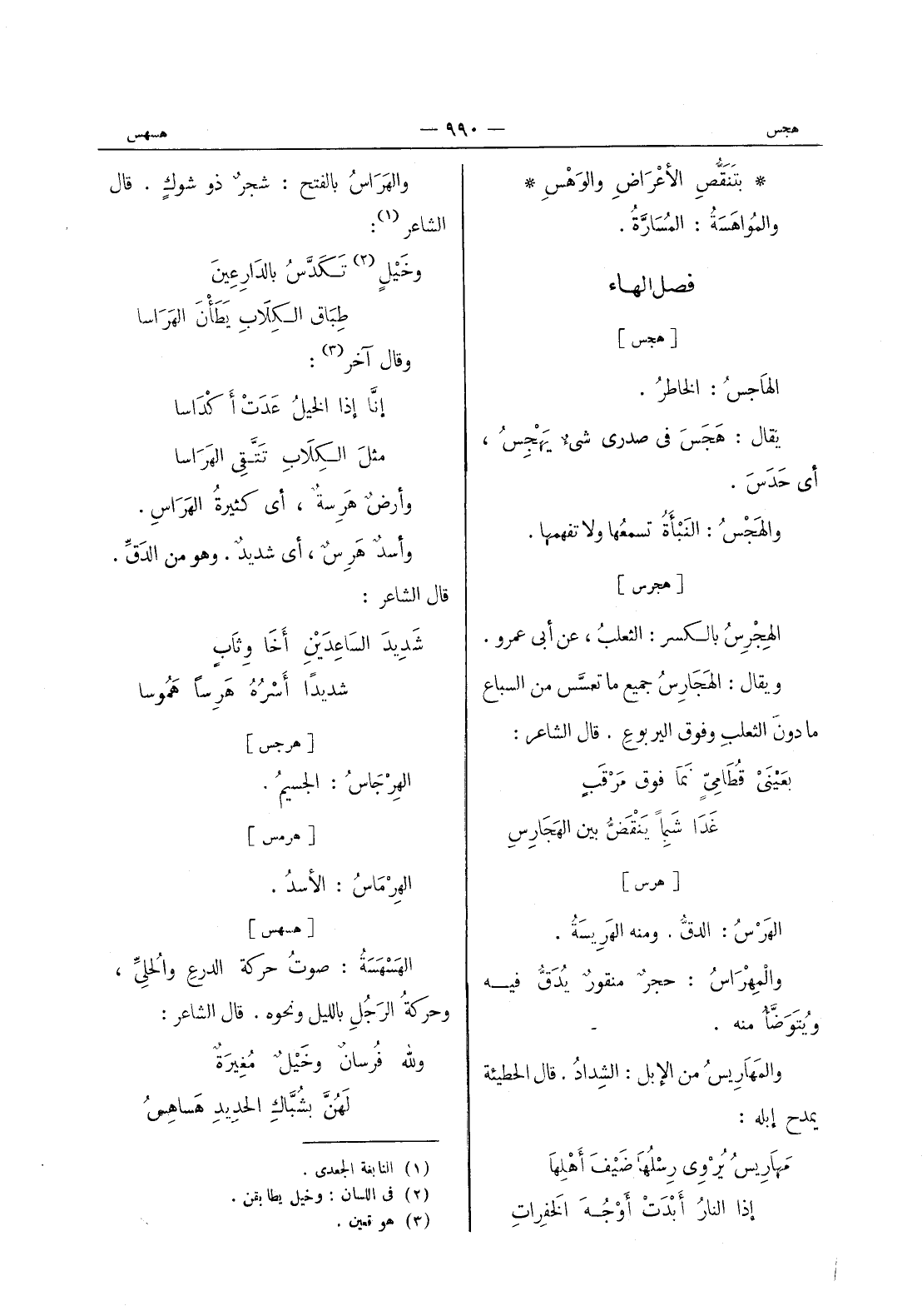والهَراسُ بالفتح: شجرٌ ذو شوكٍ. قال الشاعر (¬1) : وخيل (¬2) تكدس بالدارعين * طباق الكلاب يطأن الهراسا * وقال آخر (¬3) : إنا إذا الخيل عدت أكداسا * مثل الكلاب تتقى الهراسا * وأرض هَرسَةٌ، أي كثيرةُ الهَراسِ. وأسدٌ هَرِسٌ، أي شديدٌ. وهو من الدَقِّ. قال الشاعر: شديدَ الساعدَيْنِ أخا وِثابٍ * شديداً أسرُهُ هرسا هموسا