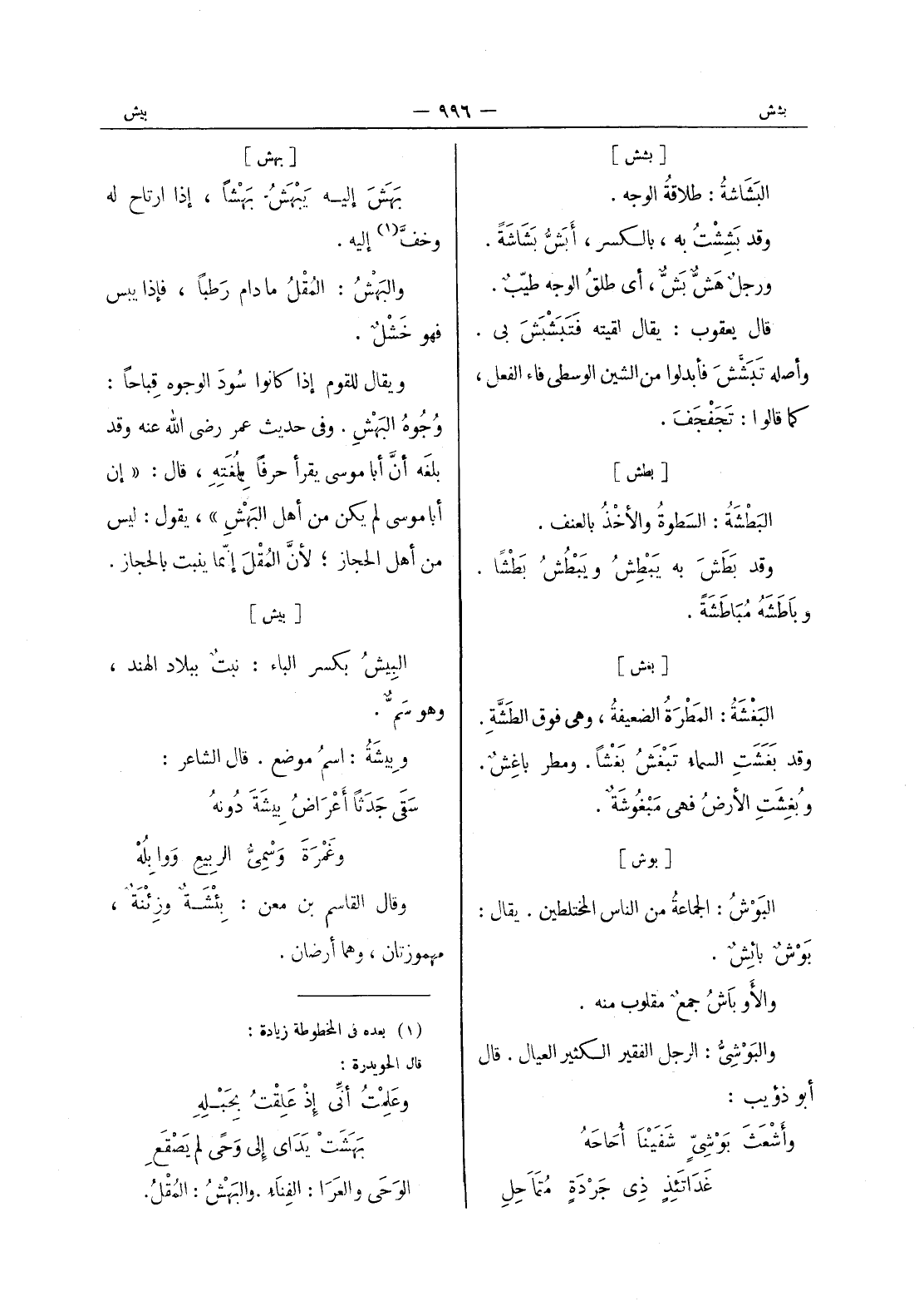 [بهش] بَهَشَ إليه يَبْهَشُ بَهْشاً، إذا ارتاح له وخفَّ (¬1) إليه. والبهش: المقل ما دام رطبا، فإذا يبس فهو خشل. ويقال للقوم إذا كانوا سودَ الوجوه قباحا: وجوه البهش. وفي حديث عمر رضي الله عنه وقد بلغه أن أبا موسى يقرأ حرفا بلغته، قال: " إن أبا موسى لم يكن من أهل البهش "، يقول: ليس من أهل الحجاز ; لان المقل إنما ينبت بالحجاز.