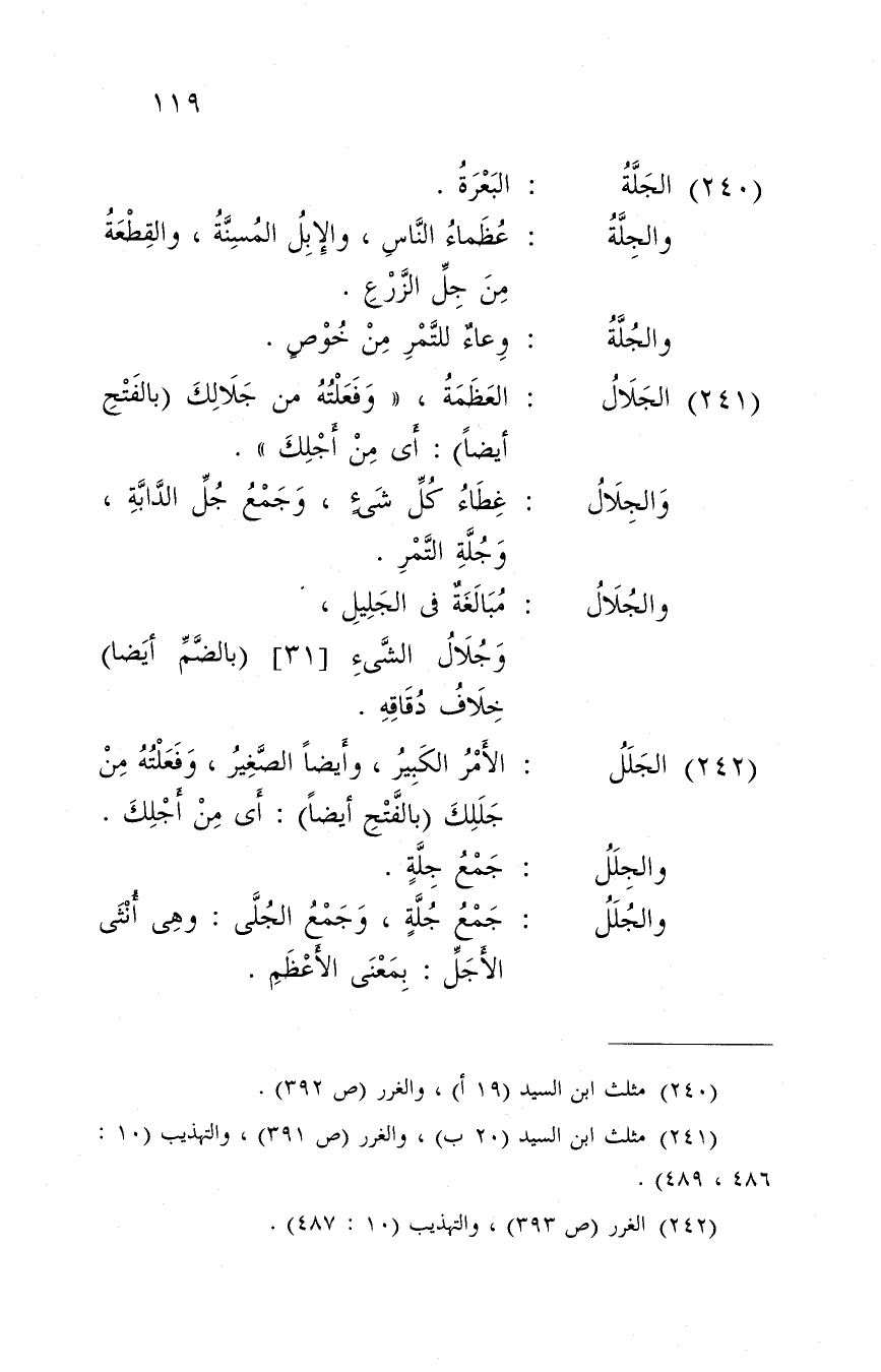 (242) الجلل الْأَمر الْكَبِير، وَأَيْضًا الصَّغِير، وفعلته من جللك (بِالْفَتْح أَيْضا) :