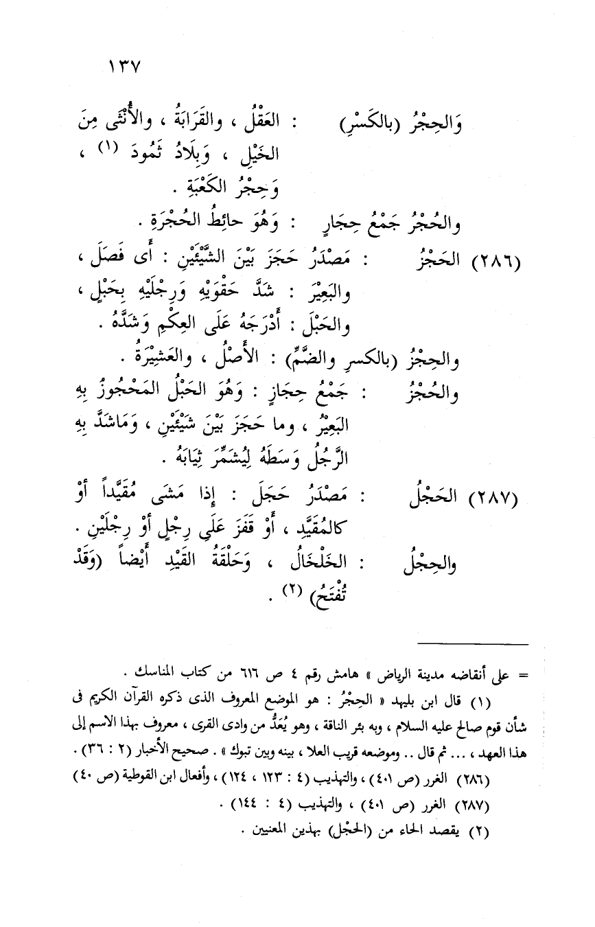الْعقل، والقرابة، وَالْأُنْثَى من الْخَيل، وبلاد ثَمُود، وَحجر الْكَعْبَة.