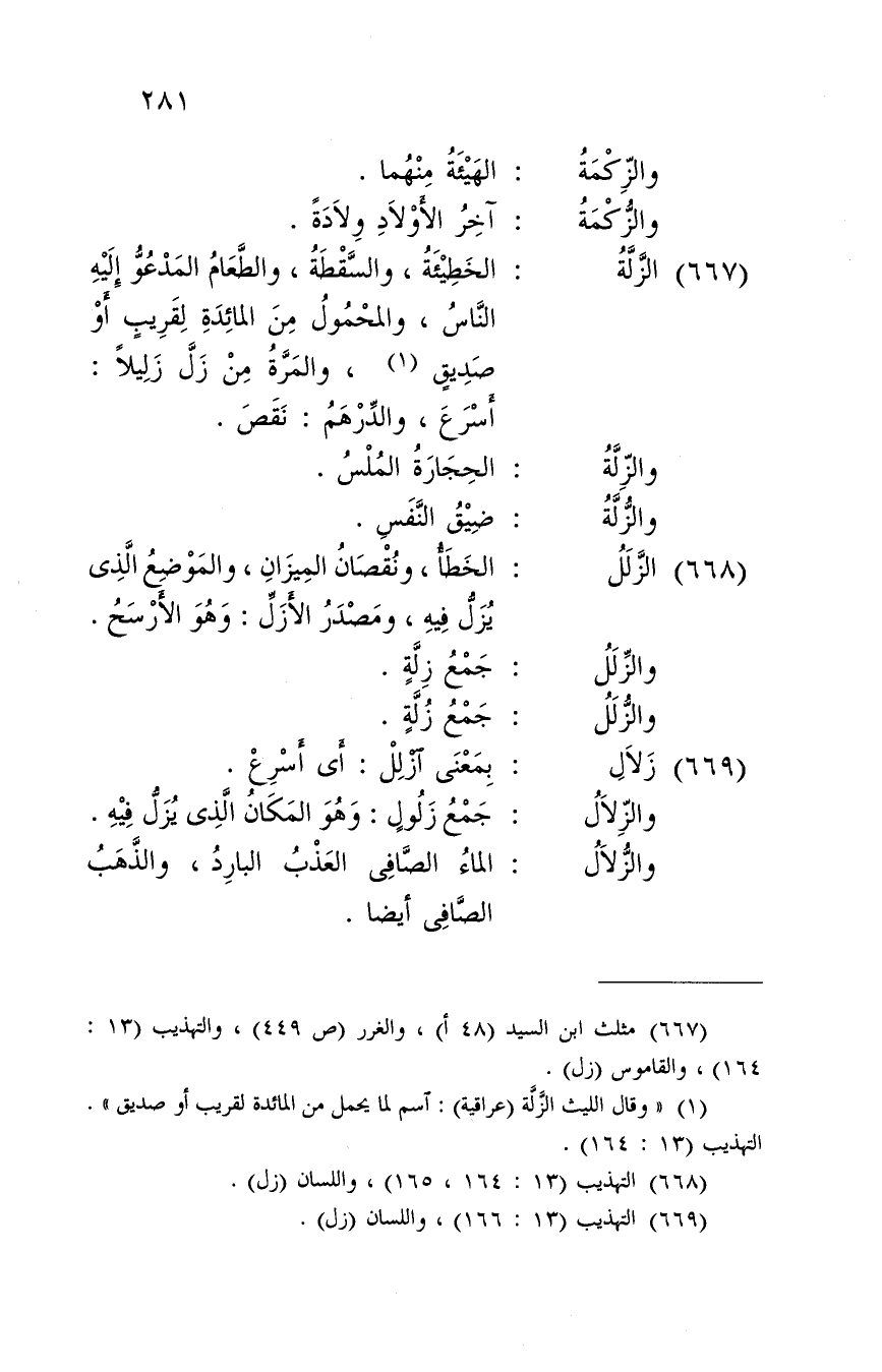 الْخَطِيئَة، والسقطة، وَالطَّعَام الْمَدْعُو إِلَيْهِ النَّاس، والمحمول من الْمَائِدَة لقريب أَو صديق، والمرة من زل زليلا:
