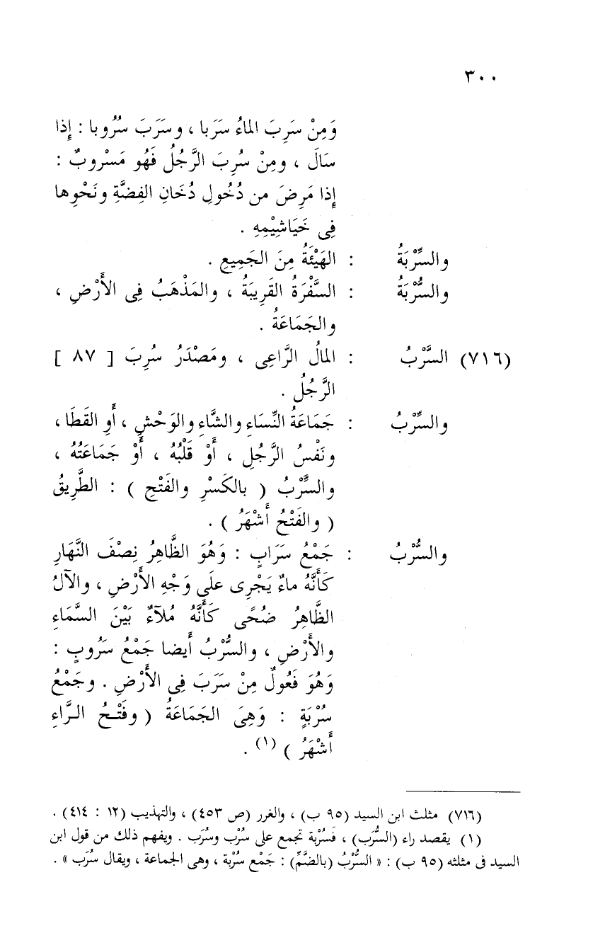 جمع سراب: وَهُوَ الظَّاهِر نصف النَّهَار كَأَنَّهُ مَاء يجْرِي على وَجه الأَرْض، والآل الظَّاهِر ضحى كَأَنَّهُ ملآء بَين السَّمَاء وَالْأَرْض، والسرب أَيْضا جمع سروب: وَهُوَ فعول من سرب فِي الأَرْض. وَجمع سربة: وَهِي الْجَمَاعَة (وَفتح الرَّاء أشهر) .