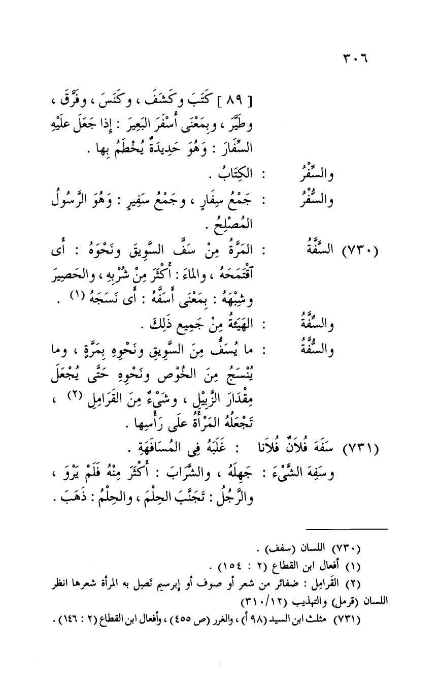 كتب وكشف، وكنس، وَفرق، وطير، وَبِمَعْنى أَسْفر الْبَعِير: إِذا جعل عَلَيْهِ السفار: وَهُوَ حَدِيدَة يخطم بهَا.