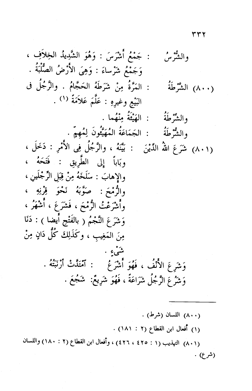 بَينه، وَالرجل فِي الْأَمر: دخل، وبابا إِلَى الطَّرِيق: فَتحه، والإهاب: سلخه من قبل الرجلَيْن، وَالرمْح: صَوبه نَحْو قرنه، وأشرعت الرمْح، فشرع، أشهر، وَشرع النَّجْم (بِالْفَتْح أَيْضا) : دنا من المغيب، وَكَذَلِكَ كل دَان من شَيْء.