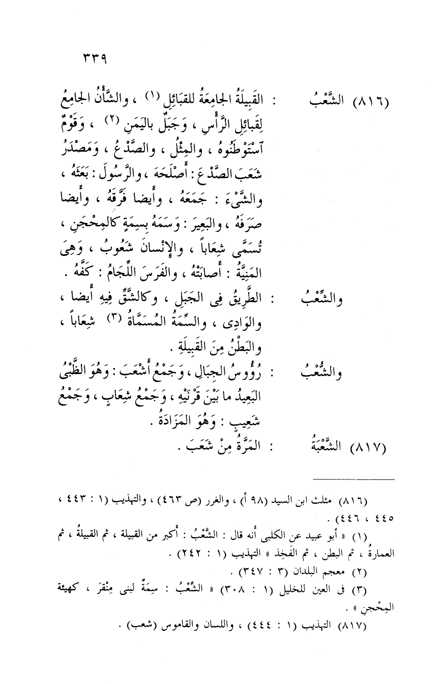 الْقَبِيلَة الجامعة للقبائل، والشأن الْجَامِع لقبائل الرَّأْس، وجبل بِالْيمن، وَقوم استوطنوه، والمثل، والصدع، ومصدر شعب الصدع: أصلحه، وَالرَّسُول: بَعثه، وَالشَّيْء: جمعه، وَأَيْضًا فرقه، وَأَيْضًا صرفه، وَالْبَعِير: وسمه بسمة كالمحجن، تسمى شعابا، وَالْإِنْسَان شعوب، وَهِي الْمنية: أَصَابَته، وَالْفرس اللجام: كَفه.