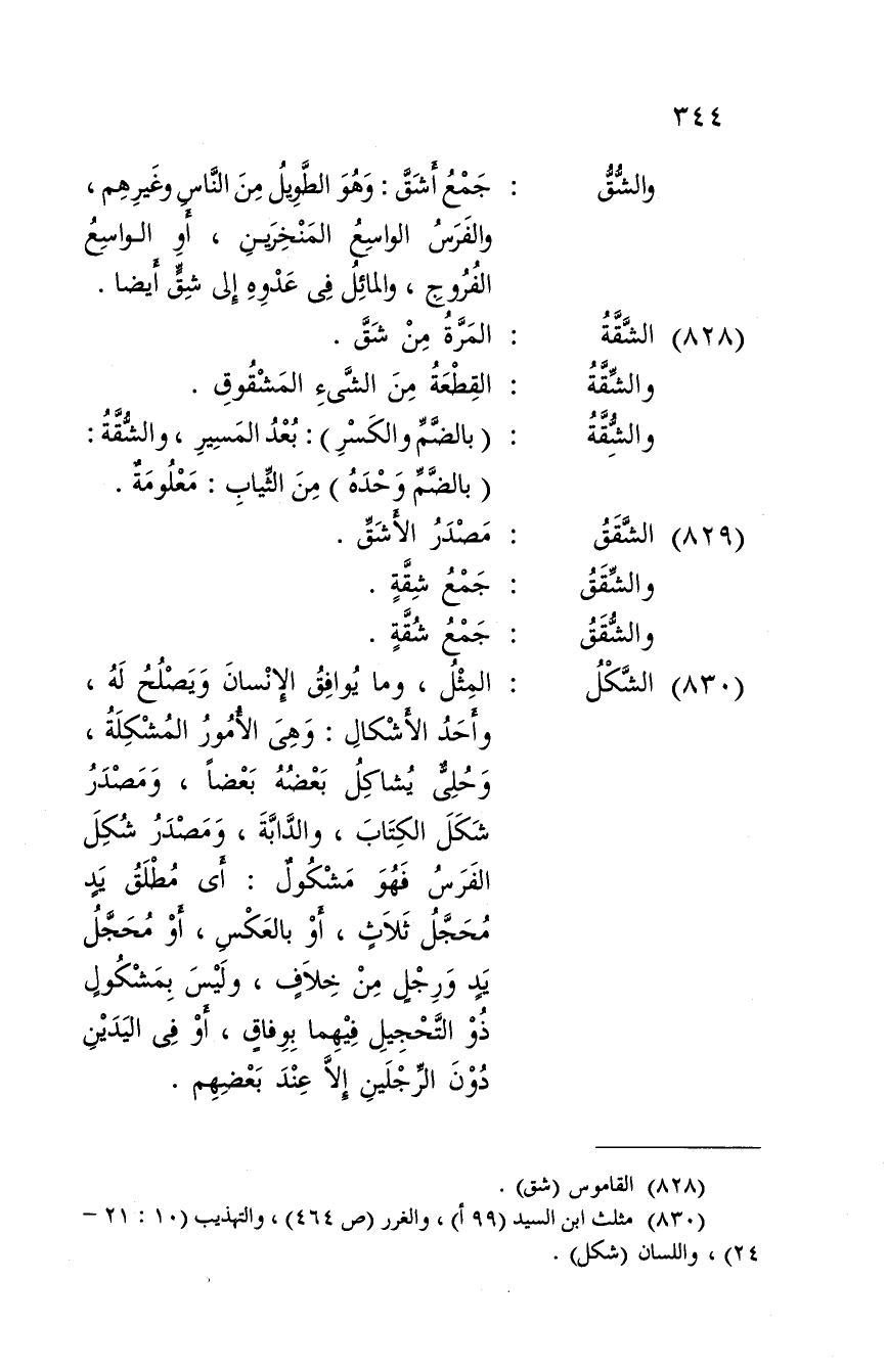 جمع أشق: وَهُوَ الطَّوِيل من النَّاس وَغَيرهم، وَالْفرس الْوَاسِع المنخرين، أَو الْوَاسِع الْفروج، والمائل فِي عدوه إِلَى شقّ أَيْضا.