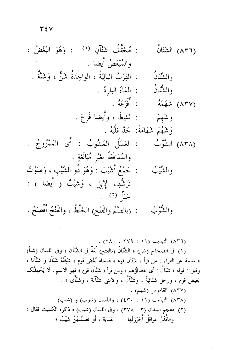 مخفف شنآن: وَهُوَ البغض، والمبغض أَيْضا.