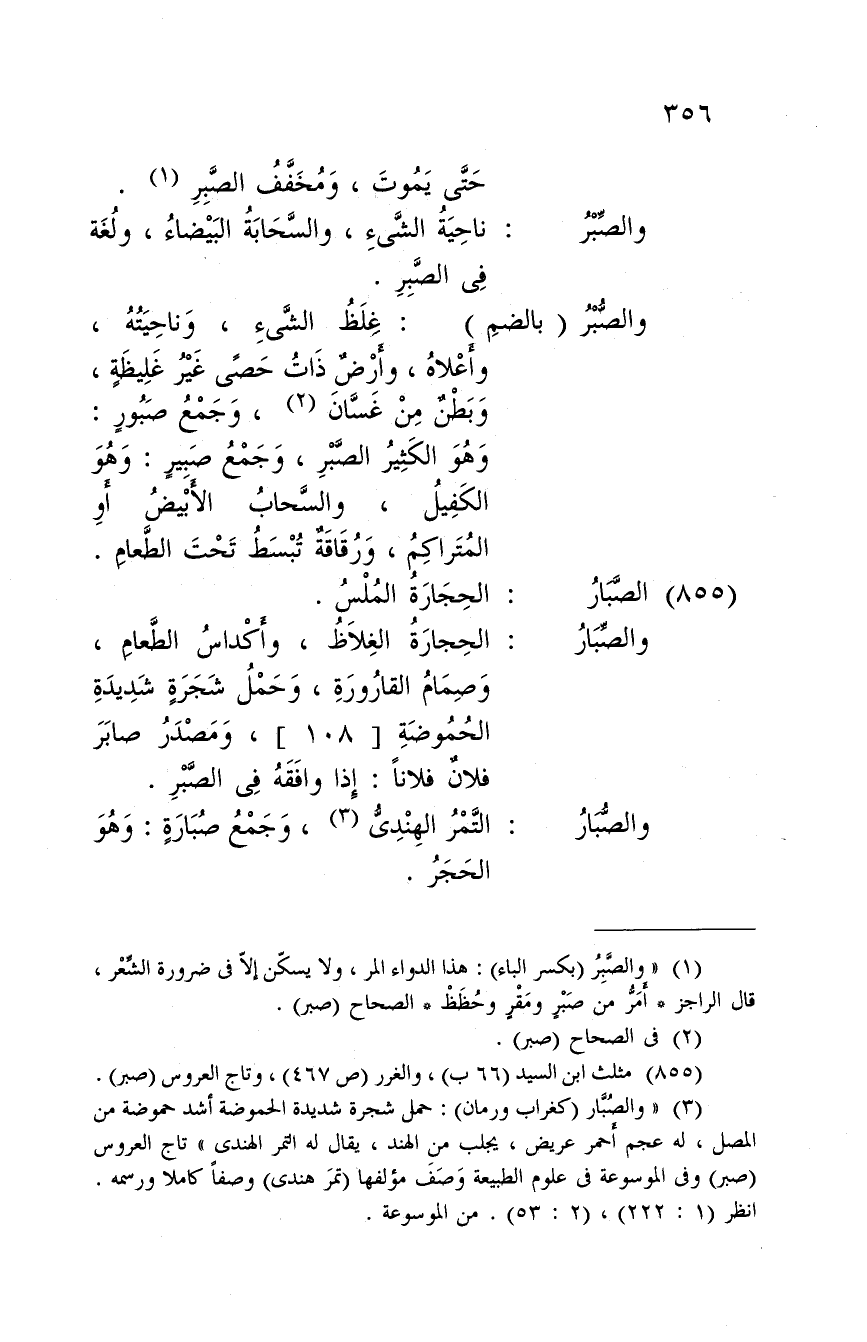 الْحِجَارَة الْغِلَاظ، وأكداس الطَّعَام، وصمام القارورة، وَحمل شَجَرَة شَدِيدَة الحموضة، ومصدر صابر فلَان فلَانا: إِذا وَافقه فِي الصَّبْر.