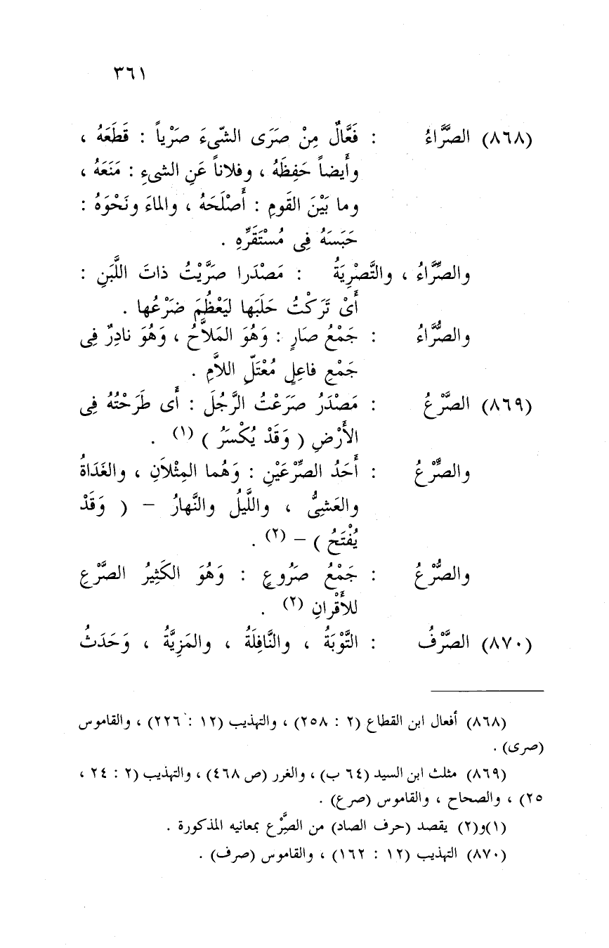 فعال من صرى الشَّيْء صريا: قطعه، وَأَيْضًا حفظه، وَفُلَانًا عَن الشَّيْء: مَنعه، وَمَا بَين الْقَوْم: أصلحه، وَالْمَاء وَنَحْوه: حَبسه فِي مستقره.