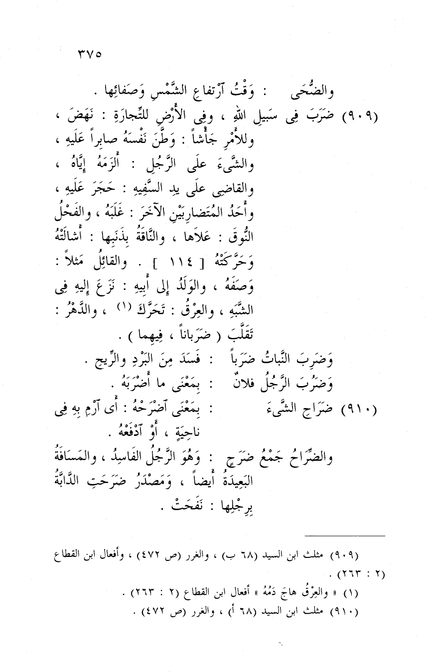 909 - ضرب فِي سَبِيل الله، وَفِي الأَرْض للتِّجَارَة: نَهَضَ، وللأمر جأشا: وَطن نَفسه صَابِرًا عَلَيْهِ، وَالشَّيْء على الرجل: ألزمهُ إِيَّاه: وَالْقَاضِي على يَد السَّفِيه: حجر عَلَيْهِ، وَأحد المتضاربين الآخر: غَلبه، والفحل النوق: علاها، والناقة بذنبها: أشالته وحركته. وَالْقَائِل مثلا: وَصفه، وَالْولد إِلَى أَبِيه: نزع إِلَيْهِ فِي الشّبَه، والعرق: تحرّك، والدهر: تقلب (ضربانا، فيهمَا) .