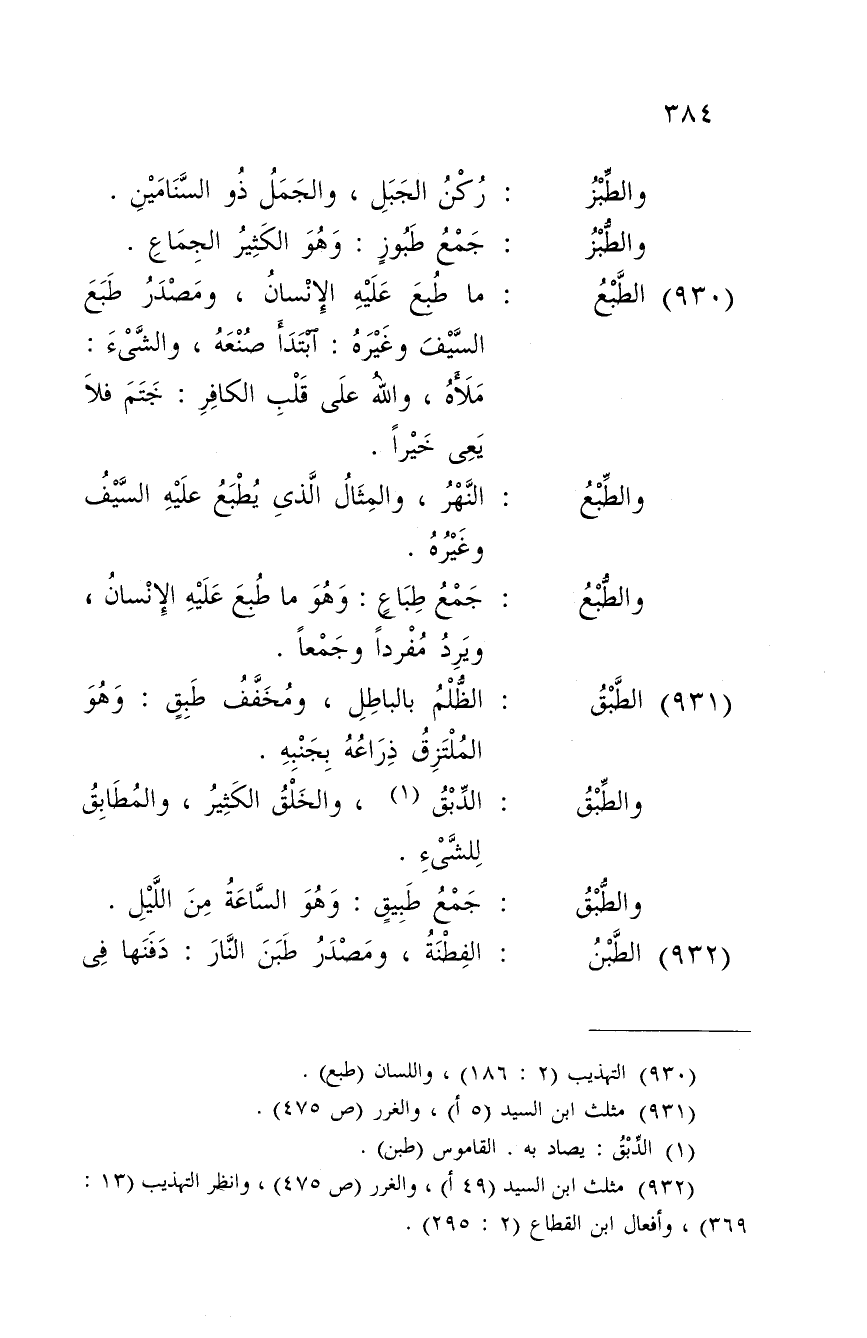 مَا طبع عَلَيْهِ الْإِنْسَان، ومصدر طبع السَّيْف وَغَيره: ابْتَدَأَ صنعه، وَالشَّيْء: ملأَهُ، وَالله على قلب الْكَافِر: ختم فَلَا يعي خيرا.