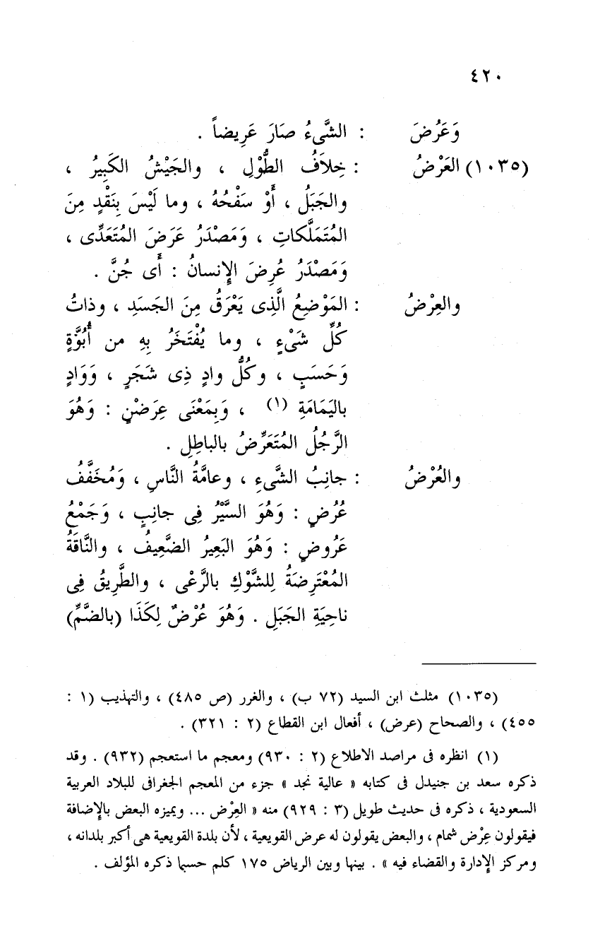 خلاف الطول، والجيش الْكَبِير، والجبل، أَو سفحه، وَمَا لَيْسَ بِنَقْد من المتملكات، ومصدر عرض الْمُتَعَدِّي، ومصدر عرض الْإِنْسَان: أَي جن.