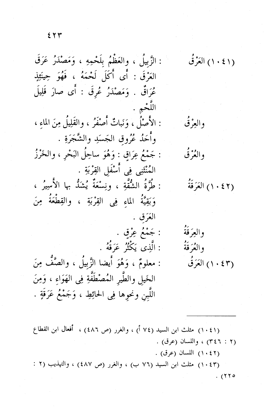 الزبيل، والعظم بِلَحْمِهِ، ومصدر عرق الْعرق: أَي أكل لَحْمه، فَهُوَ حِينَئِذٍ عراق. ومصدر عرق: أَي صَار قَلِيل اللَّحْم.