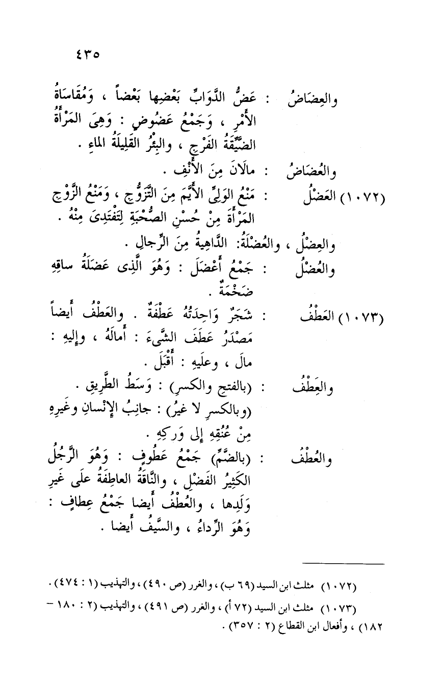 (بِالضَّمِّ) جمع عطوف: وَهُوَ الرجل الْكثير الْفضل، والناقة العاطفة على غير وَلَدهَا، والعطف أَيْضا جمع عطاف: وَهُوَ الرِّدَاء، وَالسيف أَيْضا.