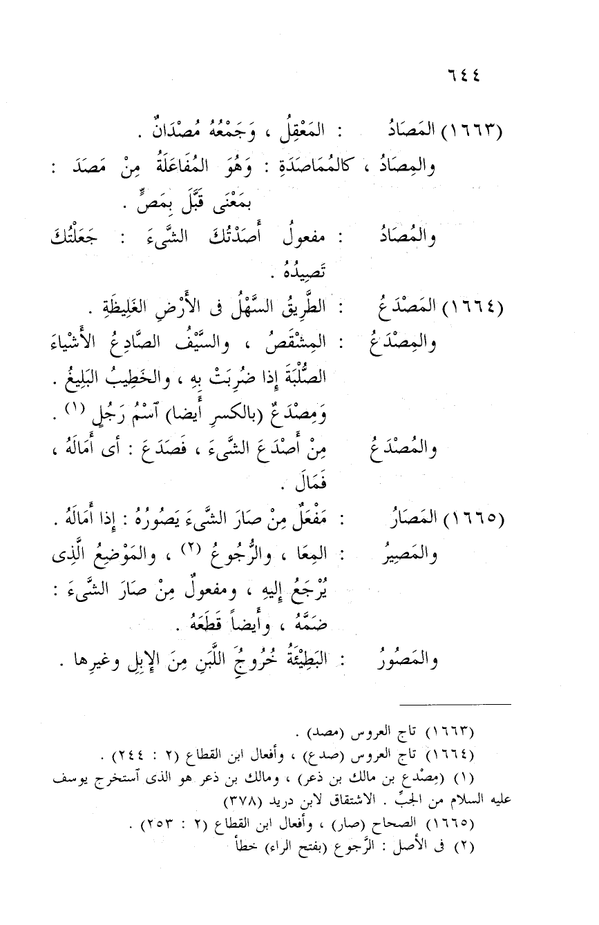 المعا، وَالرُّجُوع، والموضع الَّذِي يرجع إِلَيْهِ، ومفعول من صَار الشَّيْء: ضمه، وَأَيْضًا قطعه.