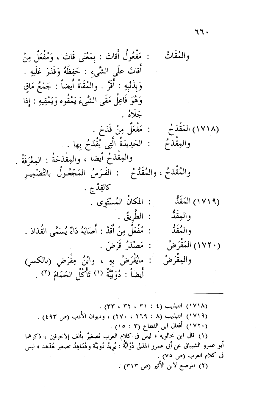 مفعول أقات: بِمَعْنى قات، ومفعل من أقات على الشَّيْء: حفظه وَقدر عَلَيْهِ. وبذنبه: أقرّ. والمقاة أَيْضا: جمع ماق وَهُوَ فَاعل مقي الشَّيْء يمقوه ويمقيه: إِذا جلاه.