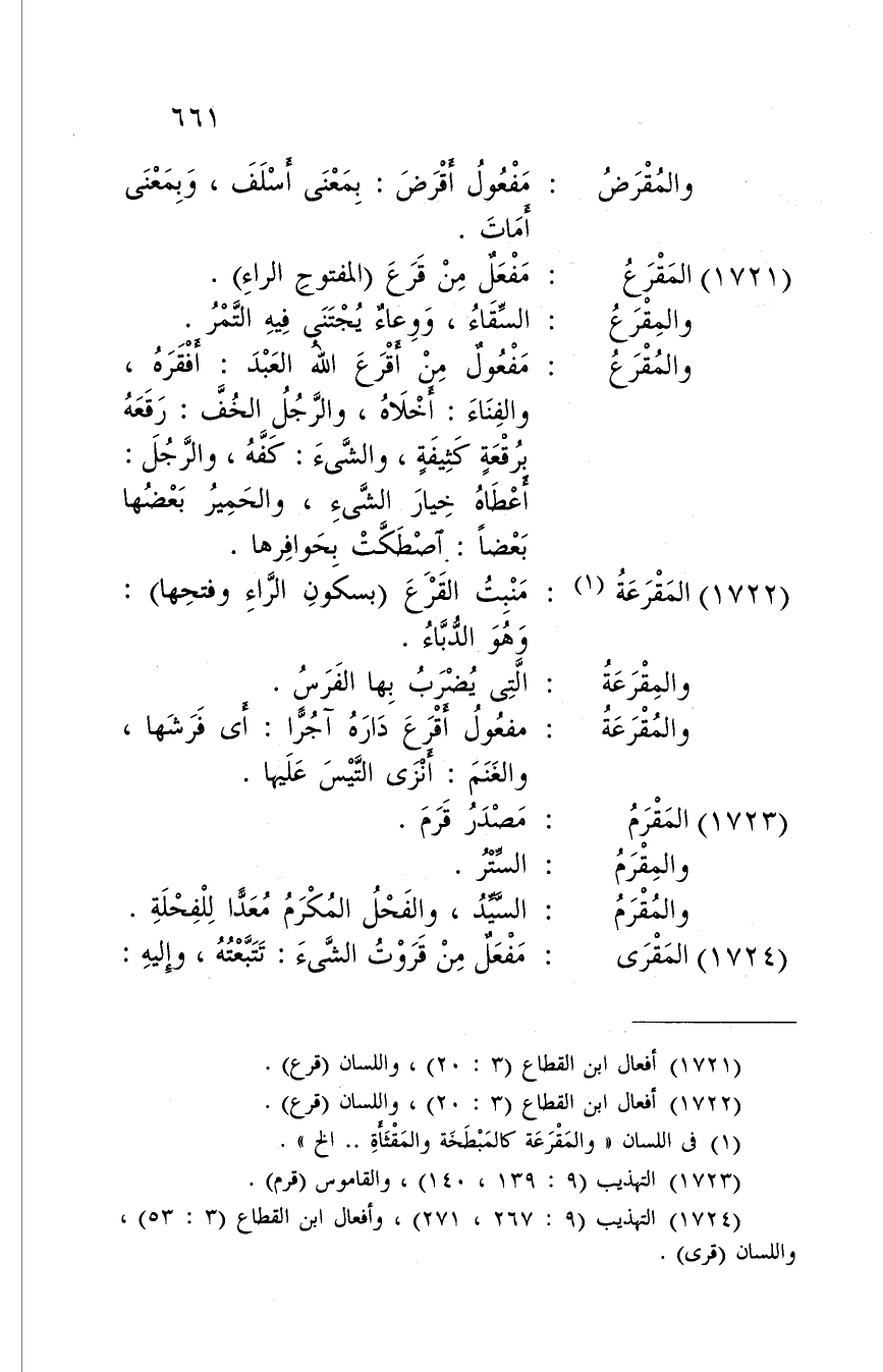 مفعول من أَقرع الله العَبْد: أفقره، والفناء: أخلاه، وَالرجل الْخُف: رقعه برقعة كثيفة، وَالشَّيْء: كَفه، وَالرجل: أعطَاهُ خِيَار الشَّيْء، وَالْحمير بَعْضهَا بَعْضًا: اصطكت بحوافرها.