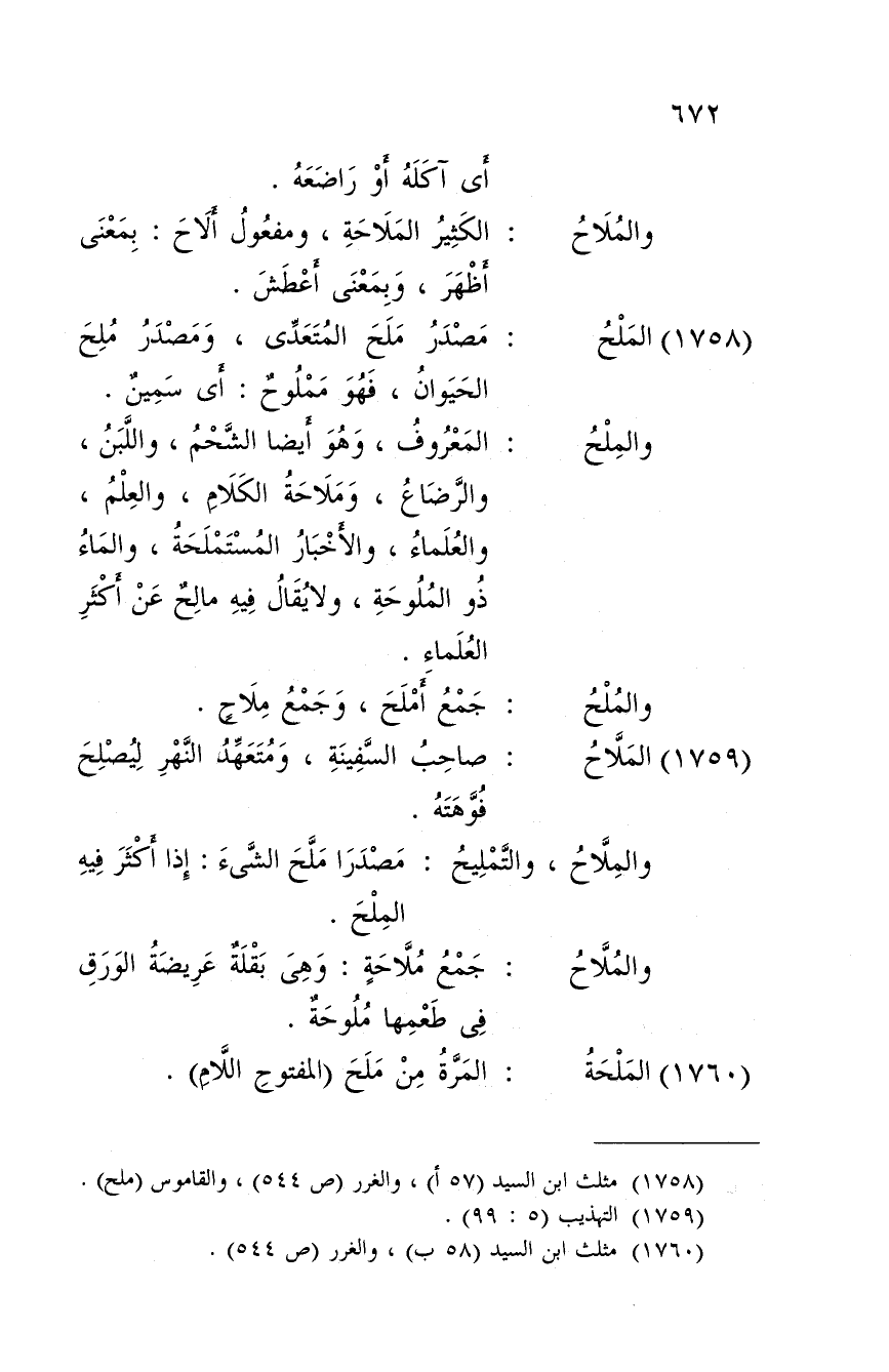 الْمَعْرُوف، وَهُوَ أَيْضا الشَّحْم، وَاللَّبن، وَالرّضَاع، وملاحة الْكَلَام، وَالْعلم، وَالْعُلَمَاء، وَالْأَخْبَار المستملحة، وَالْمَاء ذُو الملوحة، وَلَا يُقَال فِيهِ مالح عَن أَكثر الْعلمَاء.