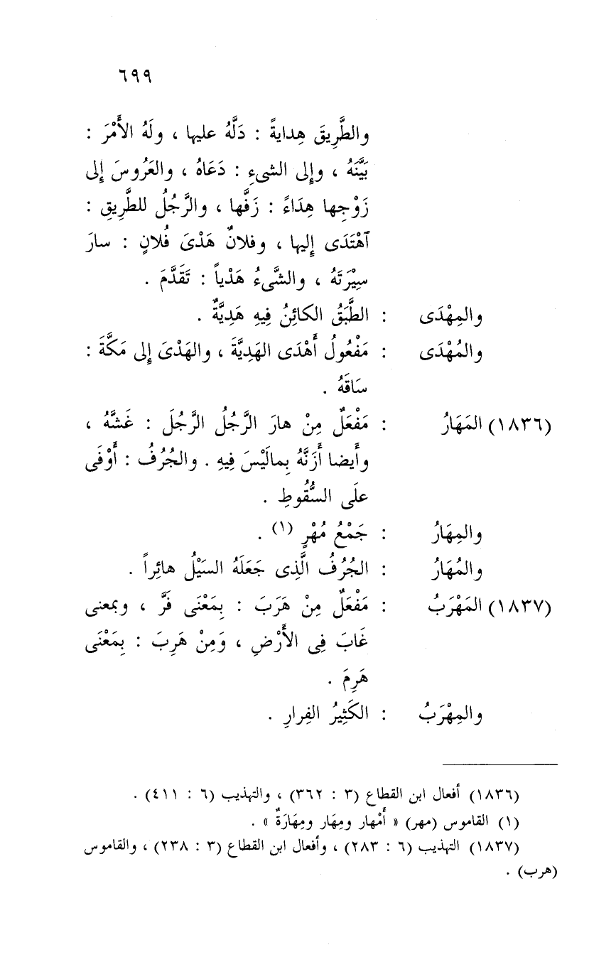 وَالطَّرِيق هِدَايَة: دله عَلَيْهَا، وَله الْأَمر: بَينه، وَإِلَى الشَّيْء: دَعَاهُ، والعروس إِلَى زَوجهَا هداء: زفها، وَالرجل للطريق: اهْتَدَى إِلَيْهَا، وَفُلَان هدى فلَان: سَار سيرته، وَالشَّيْء هَديا: تقدم.