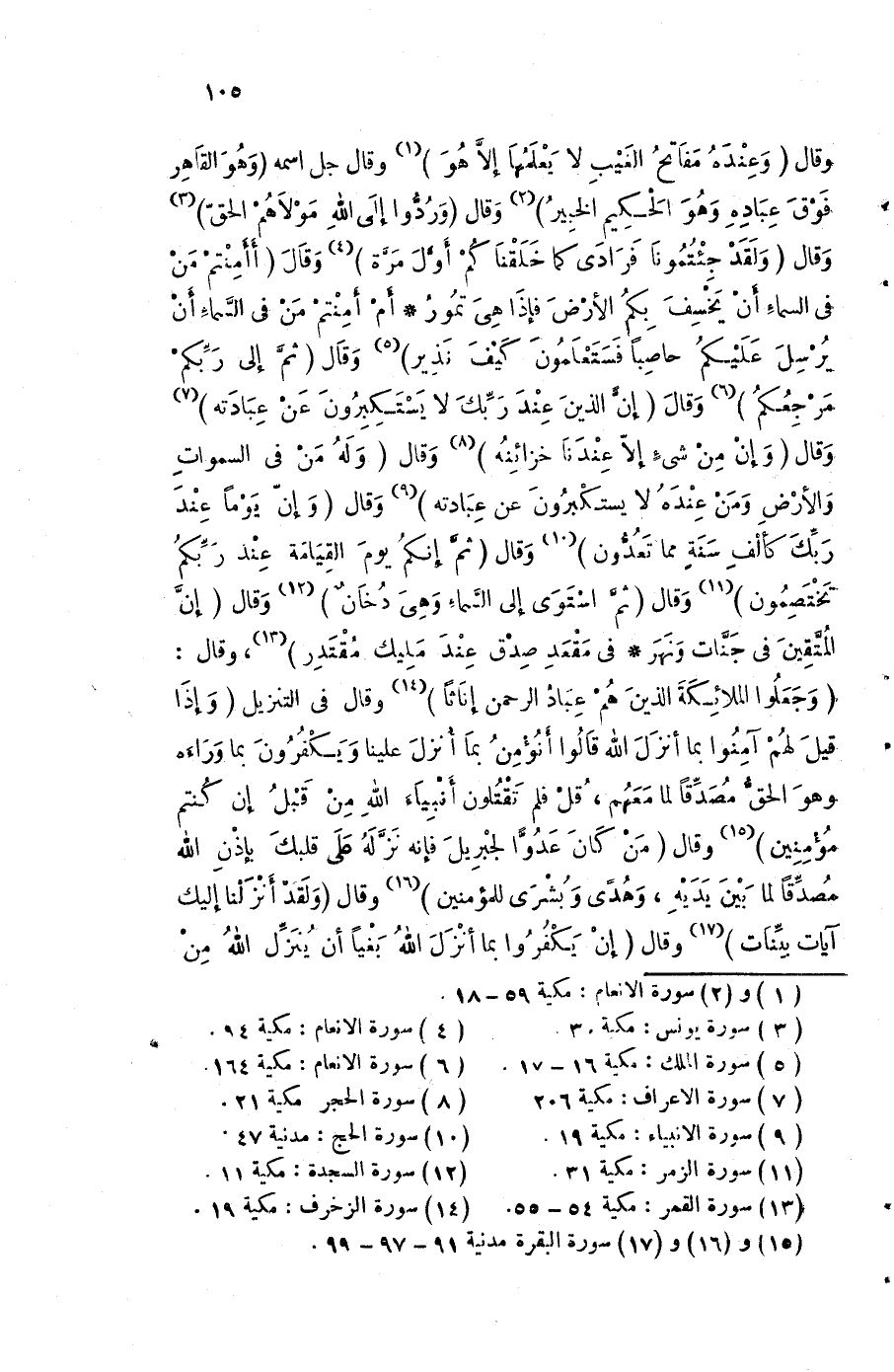 وَقَالَ {وَعِنْده مفاتح الْغَيْب لَا يعلمهَا إِلَّا هُوَ} وَقَالَ جلّ اسْمه {وَهُوَ القاهر فَوق عباده وَهُوَ الْحَكِيم الْخَبِير} وَقَالَ {وردوا إِلَى الله مَوْلَاهُم الْحق} وَقَالَ {وَلَقَد جئتمونا فُرَادَى كَمَا خَلَقْنَاكُمْ أول مرّة} وَقَالَ {أأمنتم من فِي السَّمَاء أَن يخسف بكم الأَرْض فَإِذا هِيَ تمور أم أمنتم من فِي السَّمَاء أَن يُرْسل عَلَيْكُم حاصبا فستعلمون كَيفَ نَذِير} وَقَالَ {ثمَّ إِلَى ربكُم مرجعكم} وَقَالَ {إِن الَّذين عِنْد رَبك لَا يَسْتَكْبِرُونَ عَن عِبَادَته} وَقَالَ وَإِن من شَيْء إِلَّا عندنَا خزائنه وَقَالَ {وَله من فِي السَّمَاوَات وَالْأَرْض وَمن عِنْده لَا يَسْتَكْبِرُونَ عَن عِبَادَته} وَقَالَ {وَإِن يَوْمًا عِنْد رَبك كألف سنة مِمَّا تَعدونَ} وَقَالَ {ثمَّ إِنَّكُم يَوْم الْقِيَامَة عِنْد ربكُم تختصمون} وَقَالَ {ثمَّ اسْتَوَى إِلَى السَّمَاء وَهِي دُخان} وَقَالَ {إِن الْمُتَّقِينَ فِي جنَّات ونهر فِي مقْعد صدق عِنْد مليك مقتدر} وَقَالَ {وَجعلُوا الْمَلَائِكَة الَّذين هم عباد الرَّحْمَن إِنَاثًا} وَقَالَ فِي التَّنْزِيل وَإِذا قيل لَهُم آمنُوا بِمَا أنزل الله قَالُوا أنؤمن بِمَا أنزل علينا ويكفرون بِمَا وَرَاءه وَهُوَ الْحق مُصدقا لما مَعَهم قل فَلم تقتلون أَنْبيَاء الله من قبل إِن كُنْتُم مُؤمنين وَقَالَ {من كَانَ عدوا لجبريل فَإِنَّهُ نزله على قَلْبك بِإِذن الله مُصدقا لما بَين يَدَيْهِ وَهدى وبشرى للْمُؤْمِنين} وَقَالَ {وَلَقَد أنزلنَا إِلَيْك آيَات بَيِّنَات} وَقَالَ إِن يكفروا بِمَا أنزل الله بغيا أَن ينزل الله من