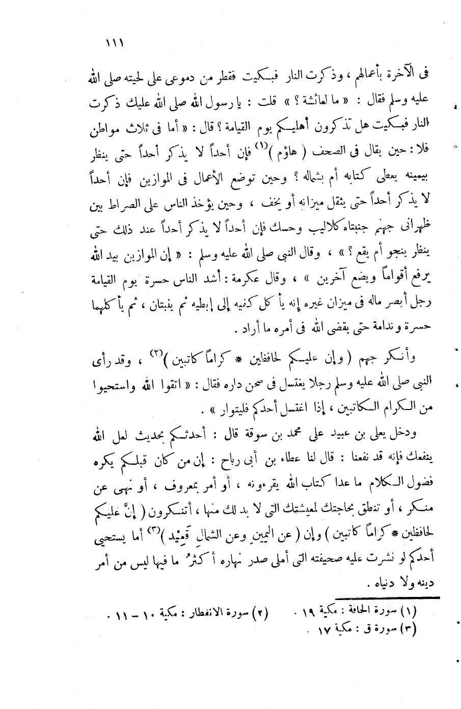 فِي الْآخِرَة بأعمالهم وَذكرت النَّار فَبَكَيْت فقطر من دموعي على لحيته صلى الله عَلَيْهِ وَسلم فَقَالَ مَا لعَائِشَة قَالَت يَا رَسُول الله صلى الله عَلَيْك ذكرت النَّار فَبَكَيْت هَل تذكرُونَ أهليكم يَوْم الْقِيَامَة قَالَ أما فِي ثَلَاث مَوَاطِن فَلَا حِين يُقَال فِي الصُّحُف {هاؤم} فَإِن أحدا لَا يذكر أحدا حَتَّى ينظر بِيَمِينِهِ يعْطى كِتَابه أم بِشمَالِهِ وَحين تُوضَع الْأَعْمَال فِي الموازين فَإِن أحدا لَا يذكر أحدا حَتَّى يثقل مِيزَانه أَو يخف وَحين يُؤْخَذ النَّاس على الصِّرَاط بَين ظهراني جَهَنَّم جنبتاه كلاليب وحسك فَإِن أحدا لَا يذكر أحدا عِنْد ذَلِك حَتَّى ينظر ينجو أم يَقع وَقَالَ النَّبِي صلى الله عَلَيْهِ وَسلم إِن الموازين بيد الله يرفع أَقْوَامًا وَيَضَع آخَرين وَقَالَ عِكْرِمَة أَشد النَّاس حسرة يَوْم الْقِيَامَة رجل أبْصر مَاله فِي ميزَان غَيره إِنَّه يَأْكُل كفيه إِلَى إبطَيْهِ ثمَّ ينبتان ثمَّ يأكلهما حسرة وندامة حَتَّى يقْضِي الله فِي أمره مَا أَرَادَ
