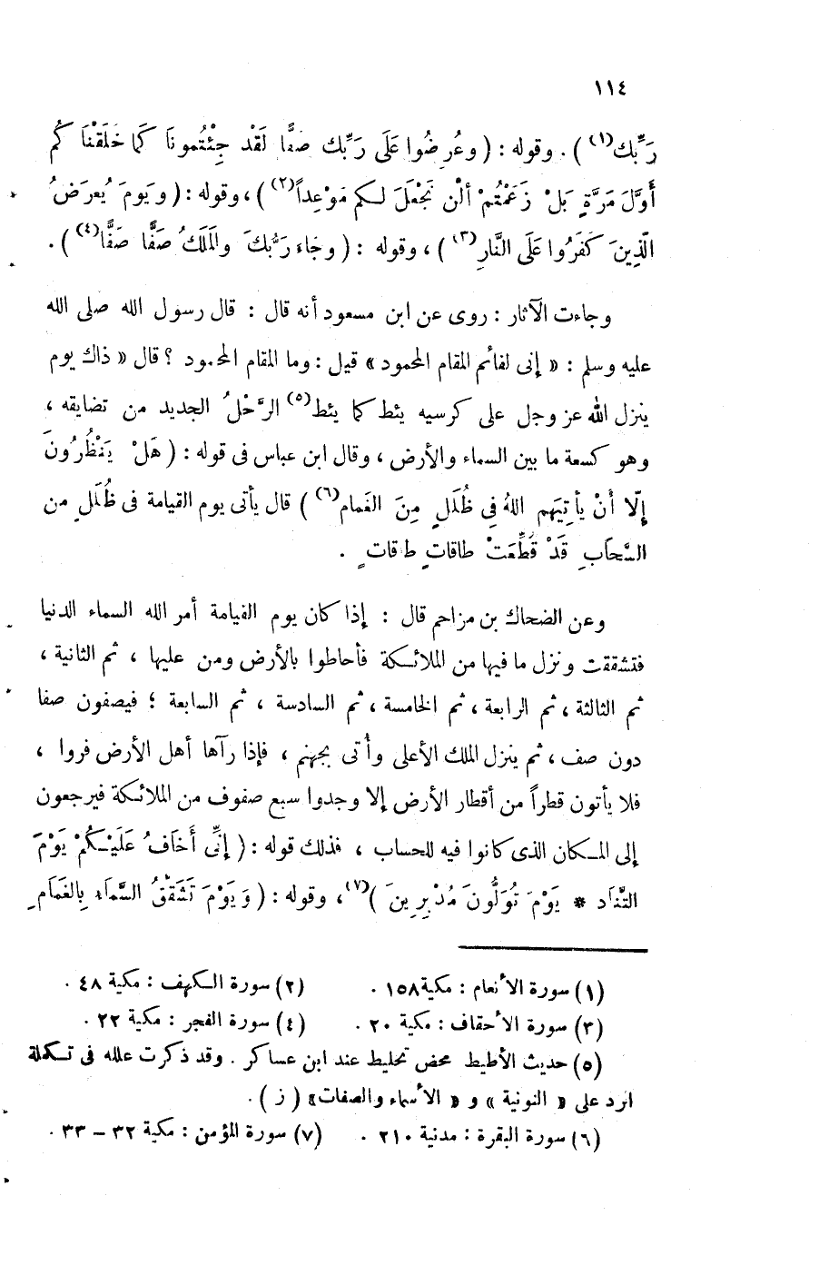 وَجَاءَت الْآثَار روى عَن ابْن مَسْعُود أَنه قَالَ قَالَ رَسُول الله صلى الله عَلَيْهِ وَسلم إِنِّي لقائم الْمقَام الْمَحْمُود قيل وَمَا الْمقَام الْمَحْمُود قَالَ ذَاك يَوْم ينزل الله عز وَجل على كرسيه يئط كَمَا يئط الرحل الْجَدِيد من تضايقه وهم كسعة مَا بَين السَّمَاء وَالْأَرْض وَقَالَ ابْن عَبَّاس فِي قَوْله {هَل ينظرُونَ إِلَّا أَن يَأْتِيهم الله فِي ظلل من الْغَمَام} قَالَ يَأْتِي يَوْم الْقِيَامَة فِي ظلل من السَّحَاب قد قطعت طاقات طاقات