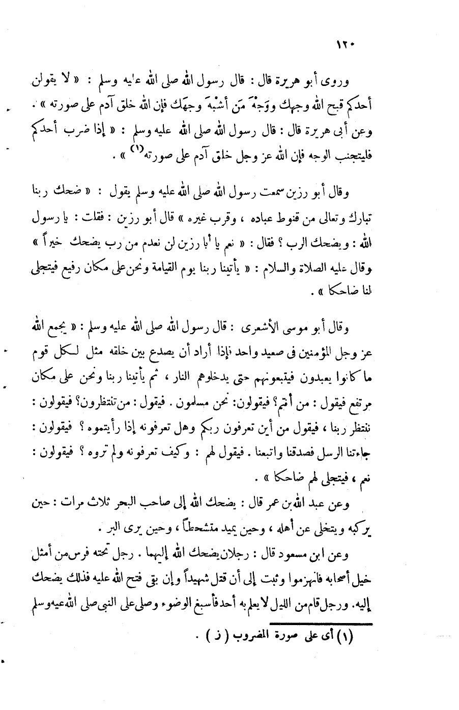 وروى أَبُو هُرَيْرَة قَالَ قَالَ رَسُول الله صلى الله عَلَيْهِ وَسلم لَا يَقُولَن أحدكُم قبح الله وَجهك وَوجه من أشبه وَجهك فَإِن الله خلق آدم على صورته وَعَن أبي هُرَيْرَة قَالَ قَالَ رَسُول الله صلى الله عَلَيْهِ وَسلم إِذا ضرب أحدكُم فليتجنب الْوَجْه فَإِن الله عز وَجل خلق آدم على صورته
