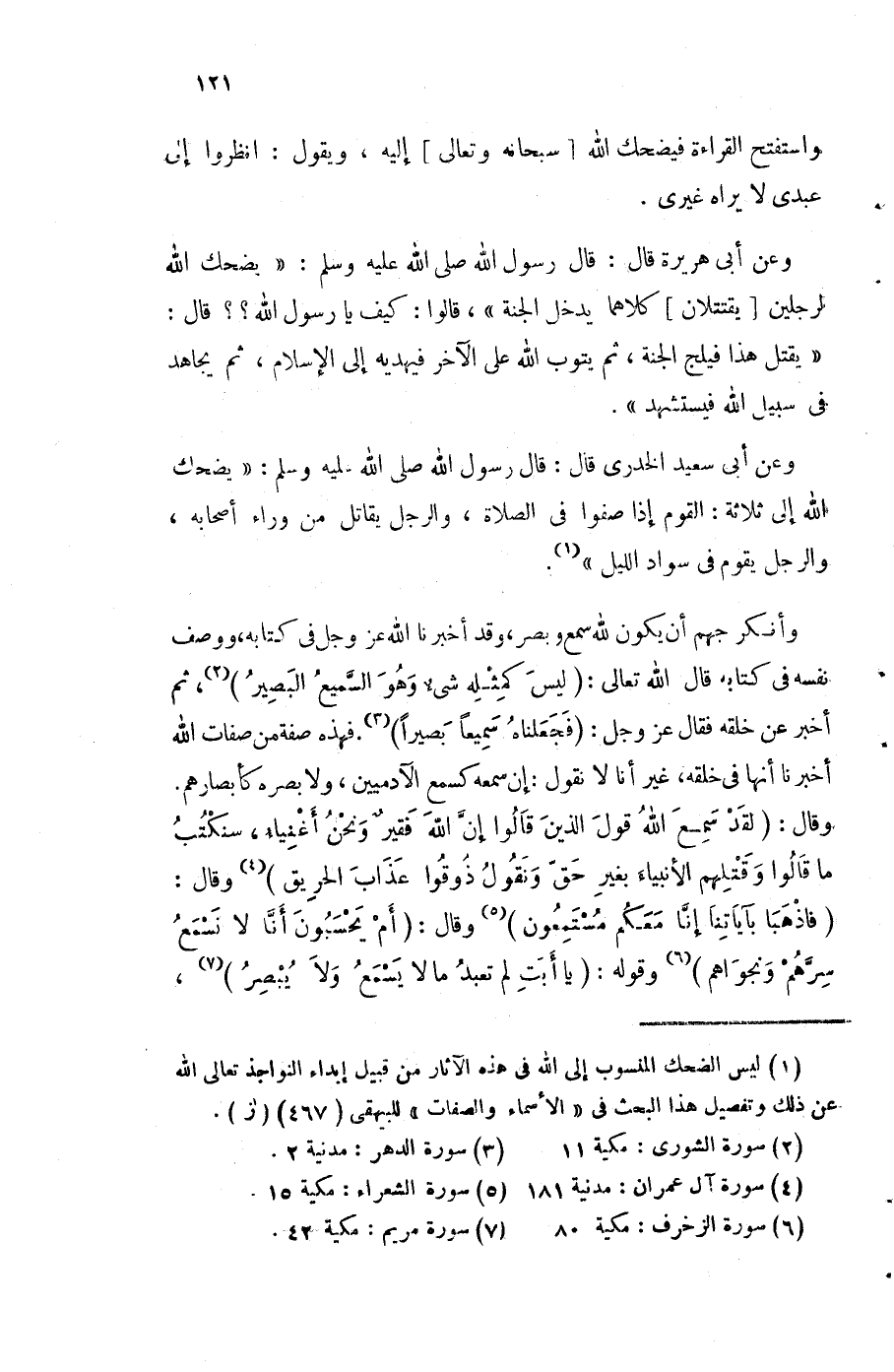 وَأنكر جهم أَن يكون لله سمع وبصر وَقد أخبرنَا الله عز وَجل فِي كِتَابه وَوصف نَفسه فِي كِتَابه قَالَ الله تَعَالَى لَيْسَ كمثله شَيْء وَهُوَ السَّمِيع الْبَصِير ثمَّ أخبر عَن خلقه قَالَ عز وَجل {فجعلناه سميعا بَصيرًا} فَهَذِهِ صفة من صِفَات الله أخبرنَا أَنَّهَا فِي خلقه غير أَنا لَا نقُول إِن سَمعه كسمع الْآدَمِيّين وَلَا بَصَره كأبصارهم وَقَالَ {لقد سمع الله قَول الَّذين قَالُوا إِن الله فَقير وَنحن أَغْنِيَاء سنكتب مَا قَالُوا وقتلهم الْأَنْبِيَاء بِغَيْر حق ونقول ذوقوا عَذَاب الْحَرِيق} وَقَالَ {فاذهبا بِآيَاتِنَا إِنَّا مَعكُمْ مستمعون} وَقَالَ {أم يحسبون أَنا لَا نسْمع سرهم ونجواهم} وَقَوله {يَا أَبَت لم تعبد مَا لَا يسمع وَلَا يبصر}