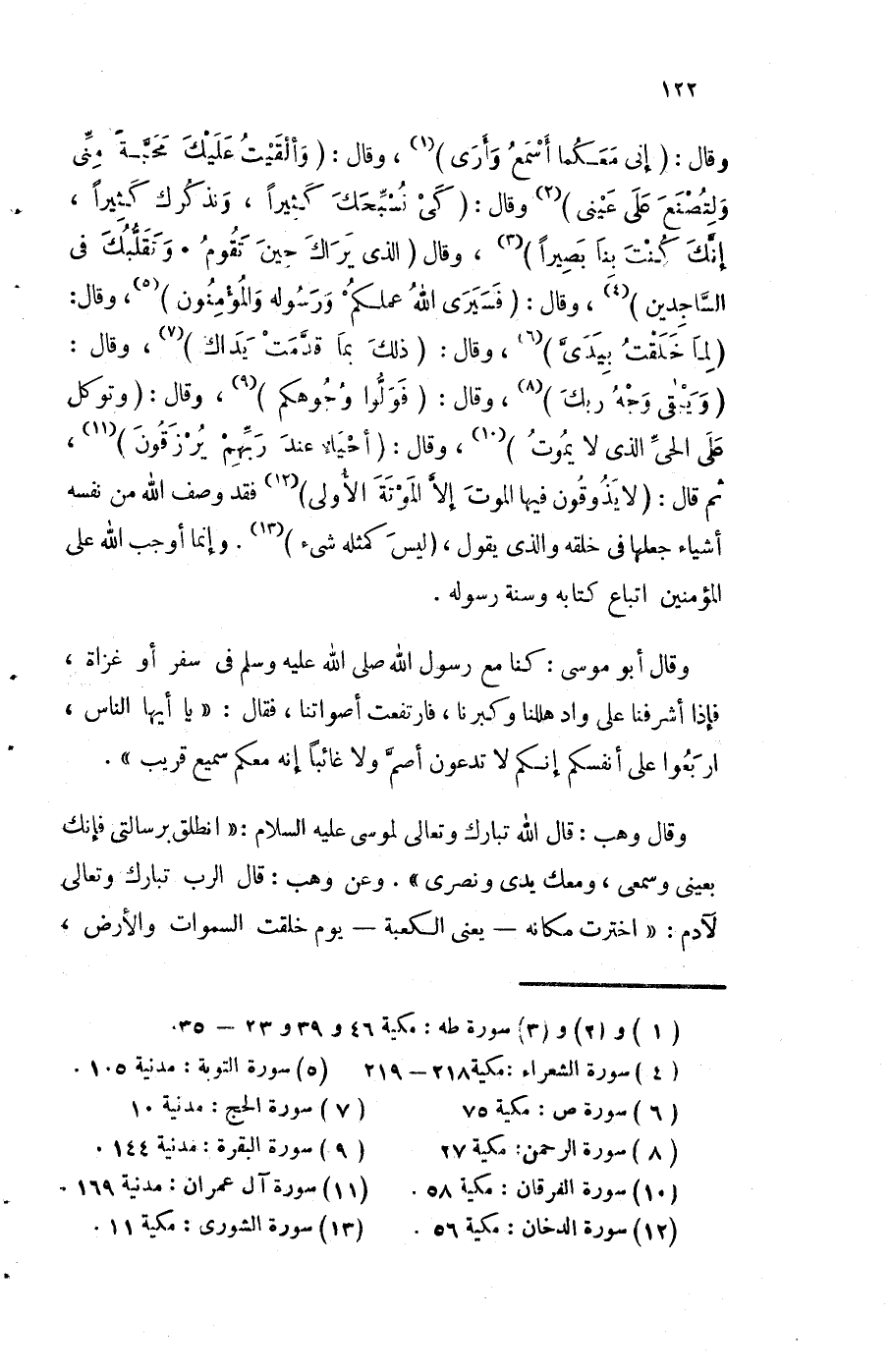 وَقَالَ إِنِّي مَعَكُمَا اسْمَع وَأرى وَقَالَ {وألقيت عَلَيْك محبَّة مني ولتصنع على عَيْني} وَقَالَ {كي نسبحك كثيرا ونذكرك كثيرا إِنَّك كنت بِنَا بَصيرًا} وَقَالَ {الَّذِي يراك حِين تقوم وتقلبك فِي الساجدين} وَقَالَ {فسيرى الله عَمَلكُمْ وَرَسُوله والمؤمنون} وَقَالَ {لما خلقت بيَدي} وَقَالَ {ذَلِك بِمَا قدمت يداك} وَقَالَ {وَيبقى وَجه رَبك} وَقَالَ {فَوَلوا وُجُوهكُم} وَقَالَ {وتوكل على الْحَيّ الَّذِي لَا يَمُوت} وَقَالَ {أَحيَاء عِنْد رَبهم يرْزقُونَ} ثمَّ قَالَ {لَا يذوقون فِيهَا الْمَوْت إِلَّا الموتة الأولى} فقد وصف الله من نَفسه أَشْيَاء جعلهَا فِي خلقه وَالَّذِي يَقُول لَيْسَ كمثله شَيْء وَإِنَّمَا أوجب الله على الْمُؤمنِينَ اتِّبَاع كِتَابه وَسنة رَسُوله