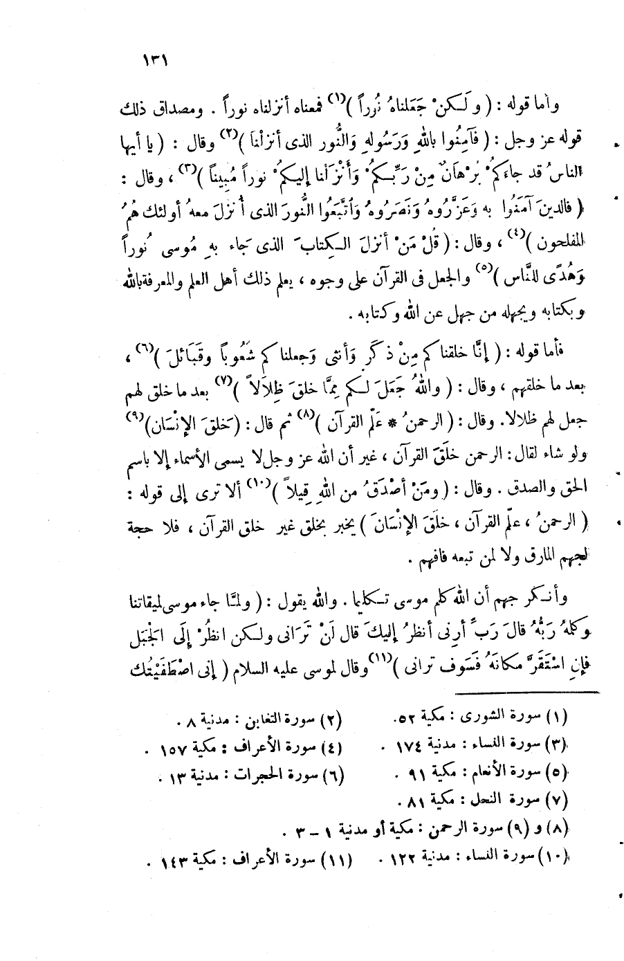 وَأما قَوْله {وَلَكِن جَعَلْنَاهُ نورا} فَمَعْنَاه أَنزَلْنَاهُ نورا ومصداق ذَلِك قَوْله عز وَجل {فآمنوا بِاللَّه وَرَسُوله والنور الَّذِي أنزلنَا} وَقَالَ {يَا أَيهَا النَّاس قد جَاءَكُم برهَان من ربكُم وأنزلنا إِلَيْكُم نورا مُبينًا} وَقَالَ {فَالَّذِينَ آمنُوا بِهِ وعزروه ونصروه وَاتبعُوا النُّور الَّذِي أنزل مَعَه أُولَئِكَ هم المفلحون} وَقَالَ {قل من أنزل الْكتاب الَّذِي جَاءَ بِهِ مُوسَى نورا وَهدى للنَّاس} والجعل فِي الْقُرْآن على وُجُوه يعلم ذَلِك أهل الْعلم والمعرفة بِاللَّه وبكتابه ويجهله من جهل عَن الله وَكتابه