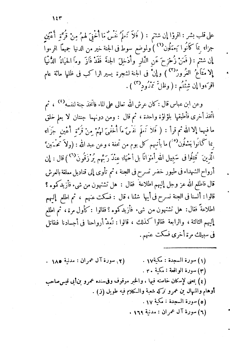 وَعَن ابْن عَبَّاس قَالَ كَانَ عرش الله تَعَالَى على المَاء فَاتخذ جنَّة لنَفسِهِ ثمَّ اتخذ أُخْرَى فأطبقها بلؤلؤة وَاحِدَة ثمَّ قَالَ وَمن دونهمَا جنتان لَا يعلم خلق مَا فيهمَا إِلَّا الله ثمَّ قَرَأَ {فَلَا تعلم نفس مَا أُخْفِي لَهُم من قُرَّة أعين جَزَاء بِمَا كَانُوا يعْملُونَ} مَا يَأْتِيهم كل يَوْم من تحفة وَعَن عبد الله {وَلَا تحسبن الَّذين قتلوا فِي سَبِيل الله أَمْوَاتًا بل أَحيَاء عِنْد رَبهم يرْزقُونَ} قَالَ إِن أَرْوَاح الشُّهَدَاء فِي طيور خضر تسرح فِي الْجنَّة ثمَّ تأوي إِلَى قناديل معلقَة بالعرش قَالَ فَاطلع الله عز وَجل إِلَيْهِم اطلاعة فَقَالَ هَل تشتهون من شَيْء فأزيدكموه قَالُوا السنا فِي الْجنَّة نَسْرَح فِي أَيهَا شِئْنَا قَالَ فَسكت عَنْهُم ثمَّ اطلع إِلَيْهِم اطلاعة فَقَالَ هَل تشتهون من شَيْء فأزيدكموه فَقَالُوا كأول مرّة ثمَّ اطلع إِلَيْهِم الثَّالِثَة وَالرَّابِعَة فَقَالُوا كَذَلِك قَالُوا تعد أَرْوَاحنَا فِي أَجْسَادنَا فنقاتل فِي سَبِيلك مرّة أُخْرَى فَسكت عَنْهُم