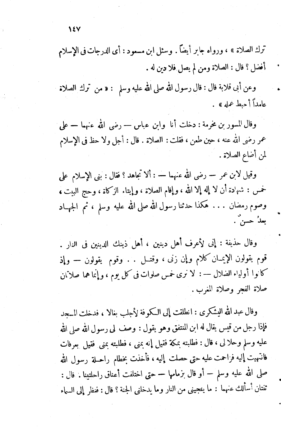 ترك الصَّلَاة وَرَوَاهُ جَابر أَيْضا وَسُئِلَ ابْن مَسْعُود أَي الدَّرَجَات فِي الْإِسْلَام أفضل قَالَ الصَّلَاة وَمن لم يصل فَلَا دين لَهُ